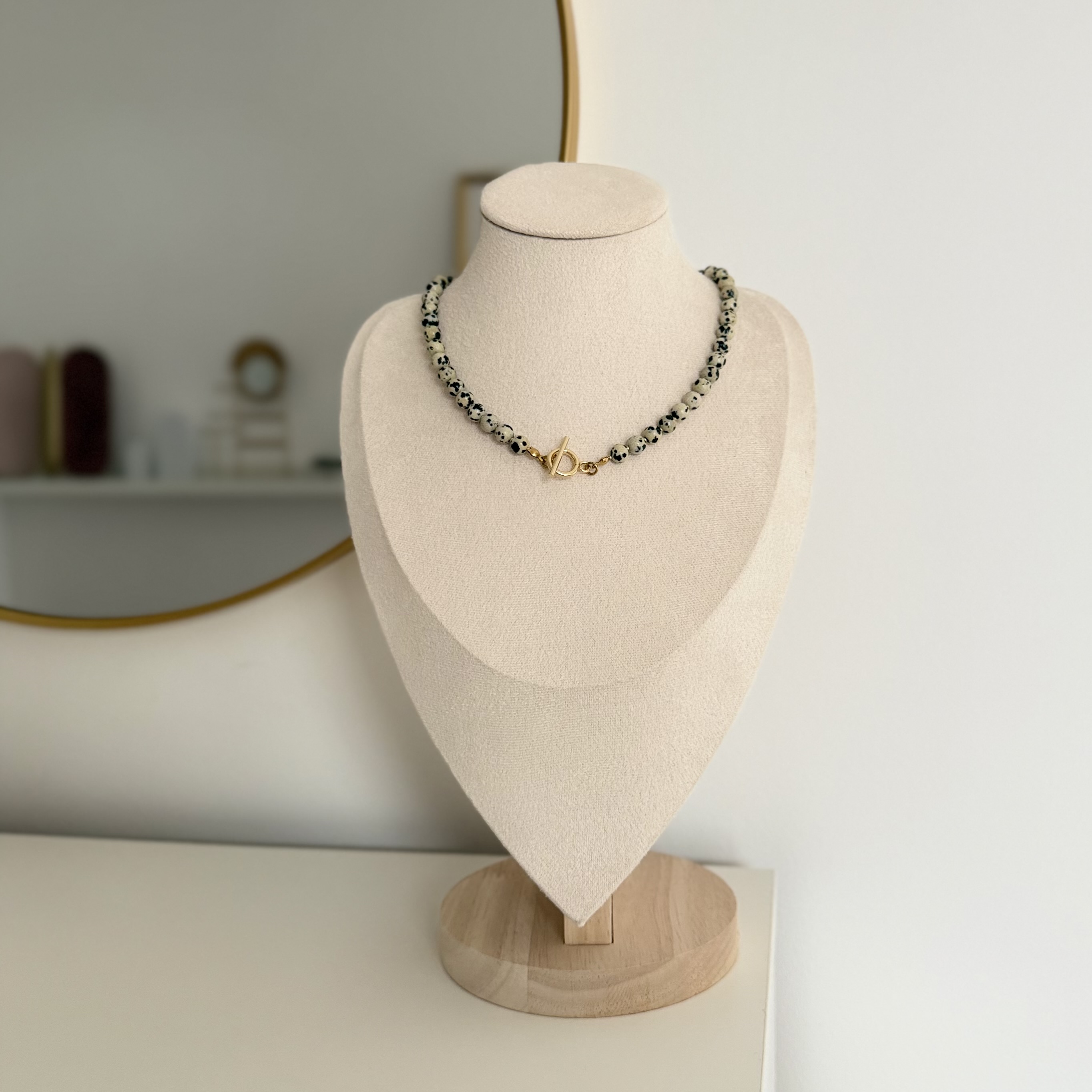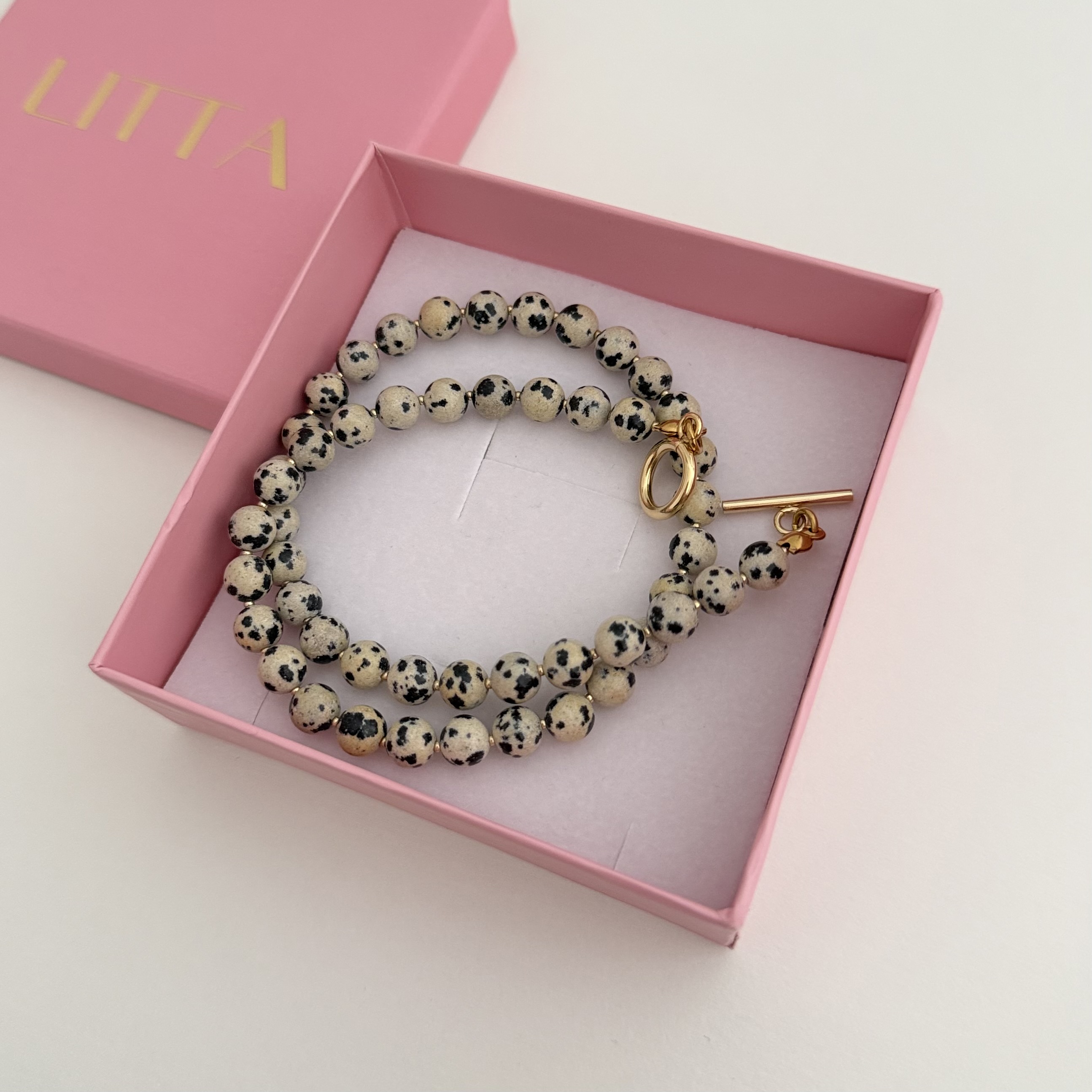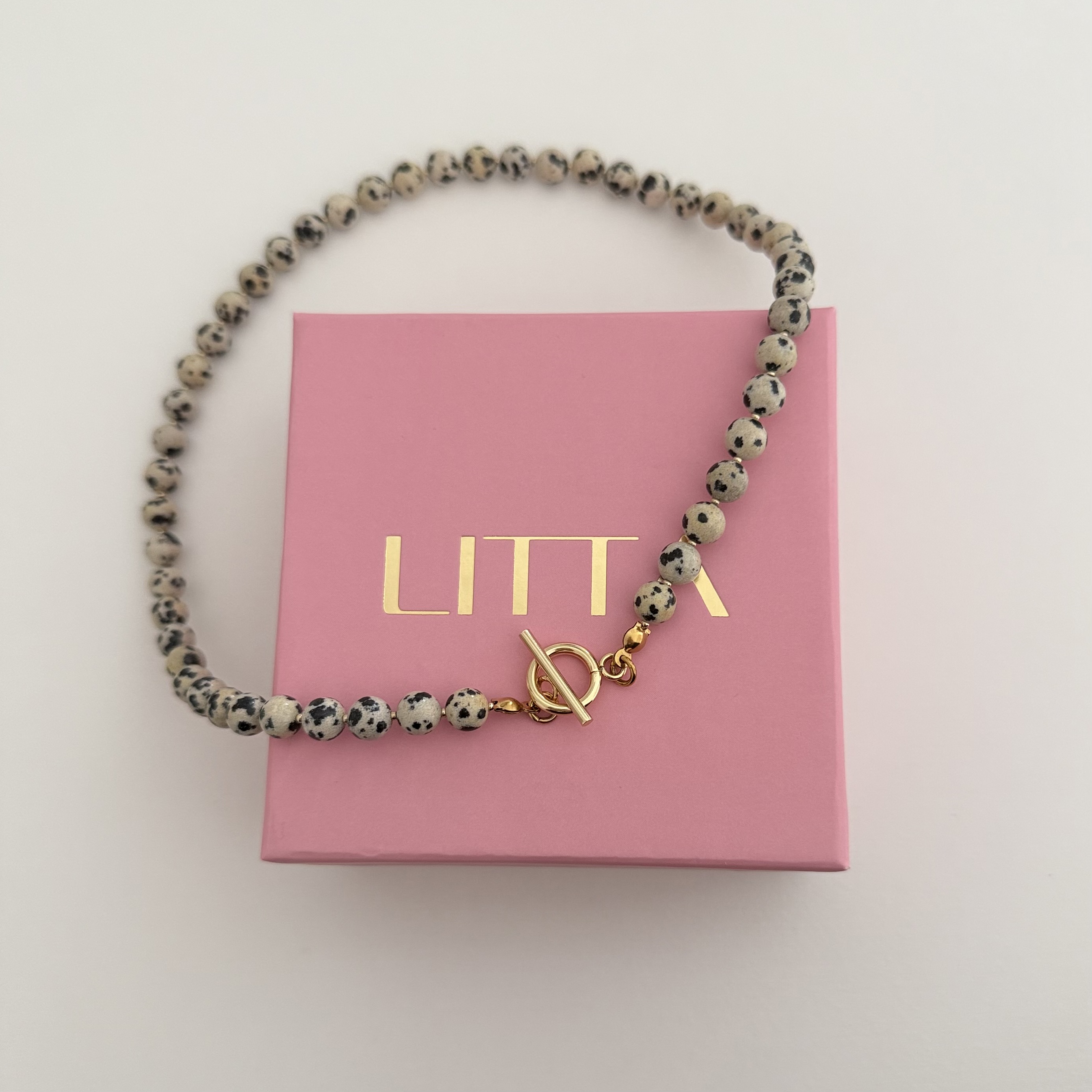 Svaki komad jaspisa je autentičan, što ovu ogrlicu čini posebnom i neponovljivom. Kopča je izrađena od nerđajućeg čelika, koji je postojan, otporan na habanje i pogodan za svakodnevno nošenje. Ogrlica se lako uklapa uz različite stilove, od ležernih do elegantnijih kombinacija, a može se nositi samostalno ili u setu sa odgovarajućim minđušama i narukvicom. Materijal: jaspis Kopca: nerđajući čelik Dužina: 41cm Izrada: ručni rad Ogrlica dolazi u brendiranoj poklon kutiji.