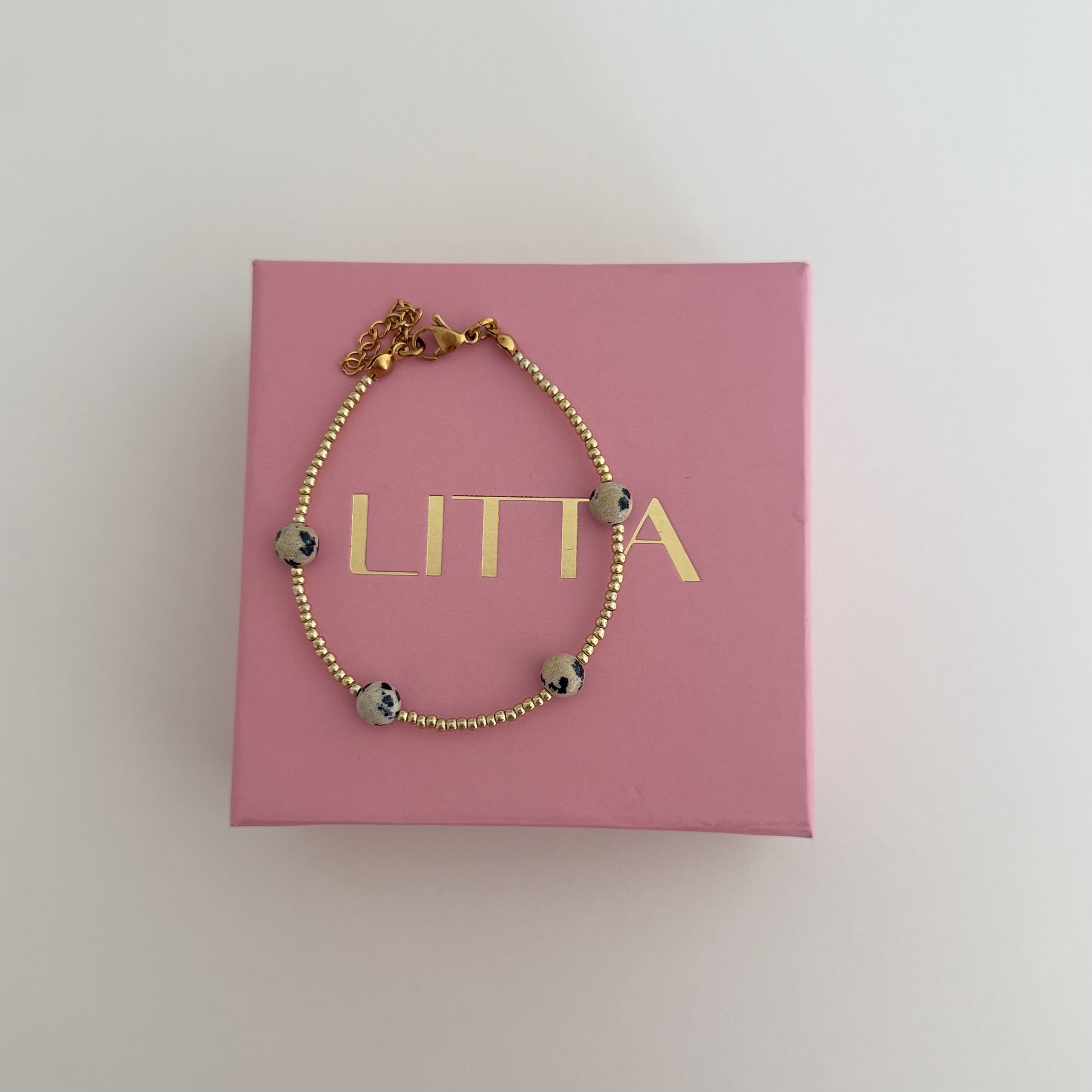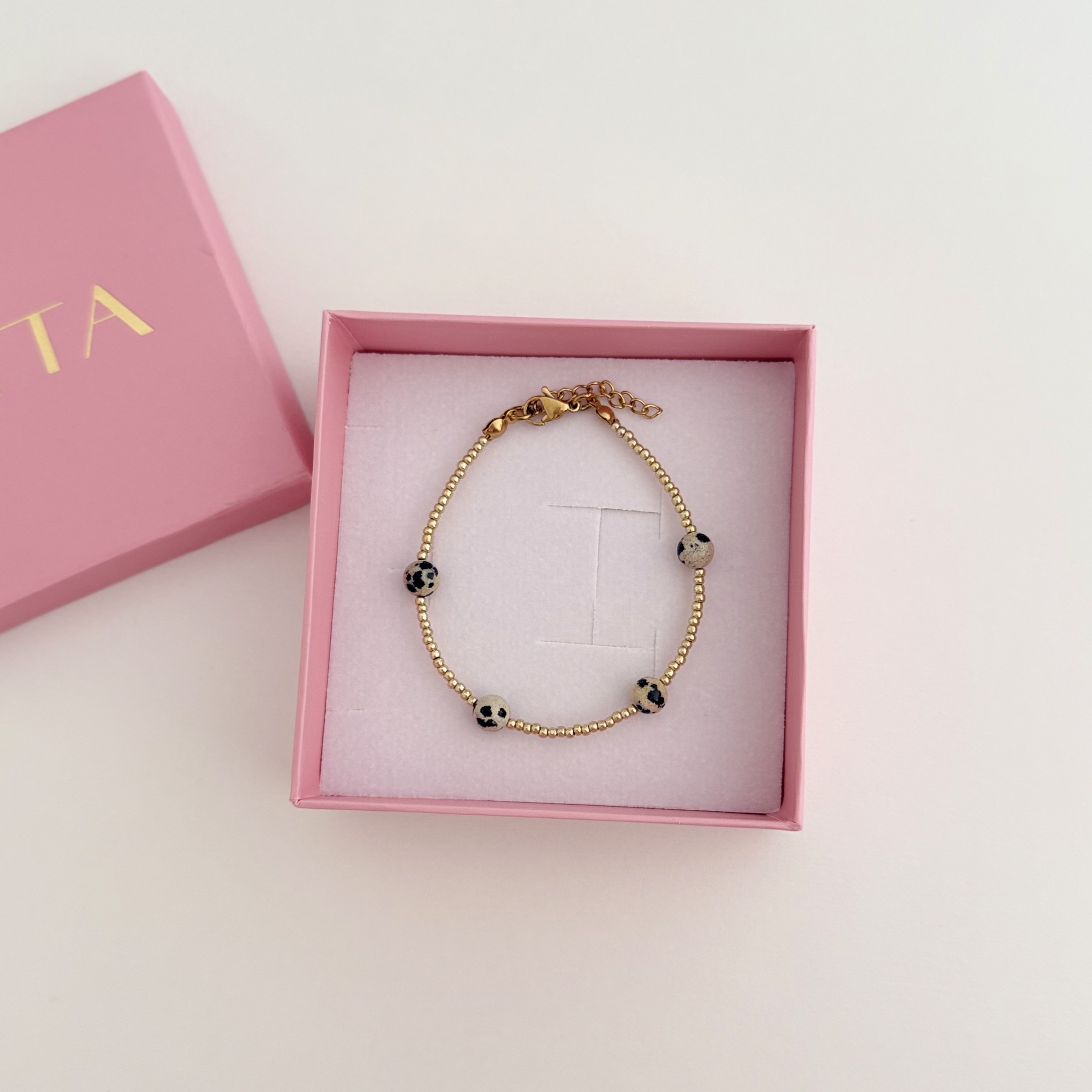 Elegantna narukvica od zlatnih preciosa perli, upotpunjena jaspisom i komponentama od nerđajućeg čelika.