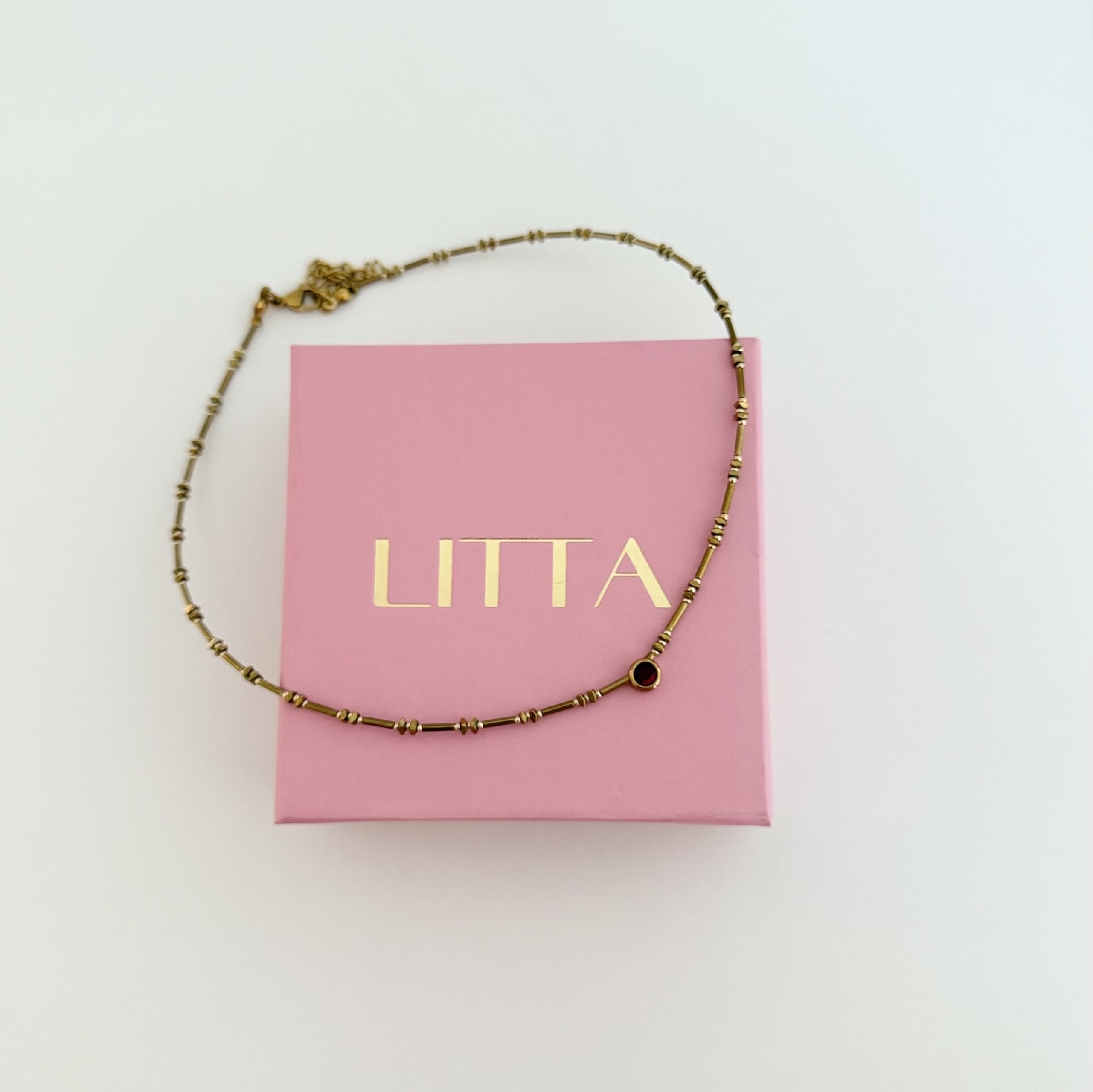 U centru se nalazi privezak sa cirkonom u intenzivnoj crvenoj boji, koji unosi dozu luksuza i topline u dizajn. Ova ogrlica savršeno balansira između minimalizma i efektnog detalja, čineći je idealnom izborom kako za svakodnevne, tako i za večernje kombinacije. Materijal: hematit Dužina: 38cm + 5cm Izrada: ručni rad Ogrlica dolazi u brendiranoj poklon kutiji.