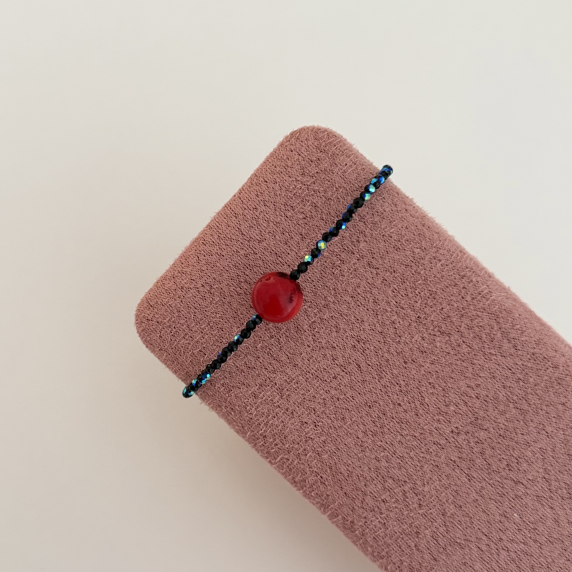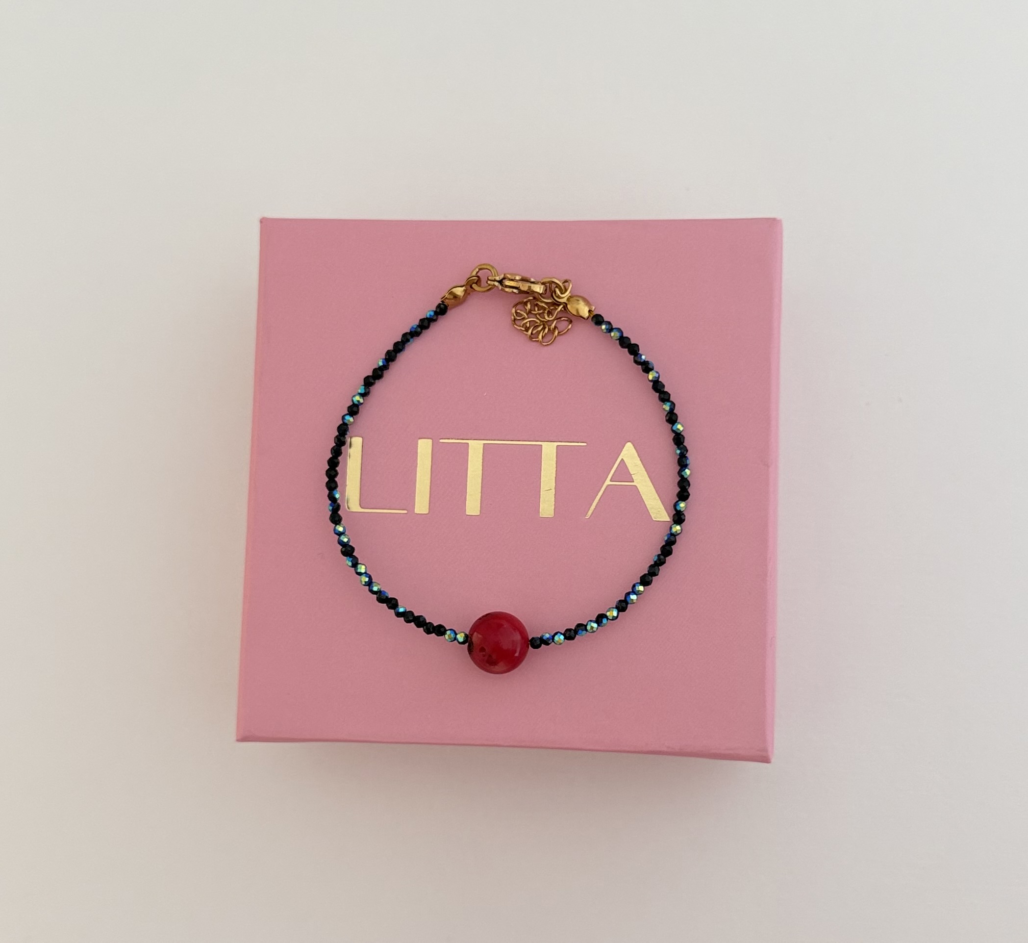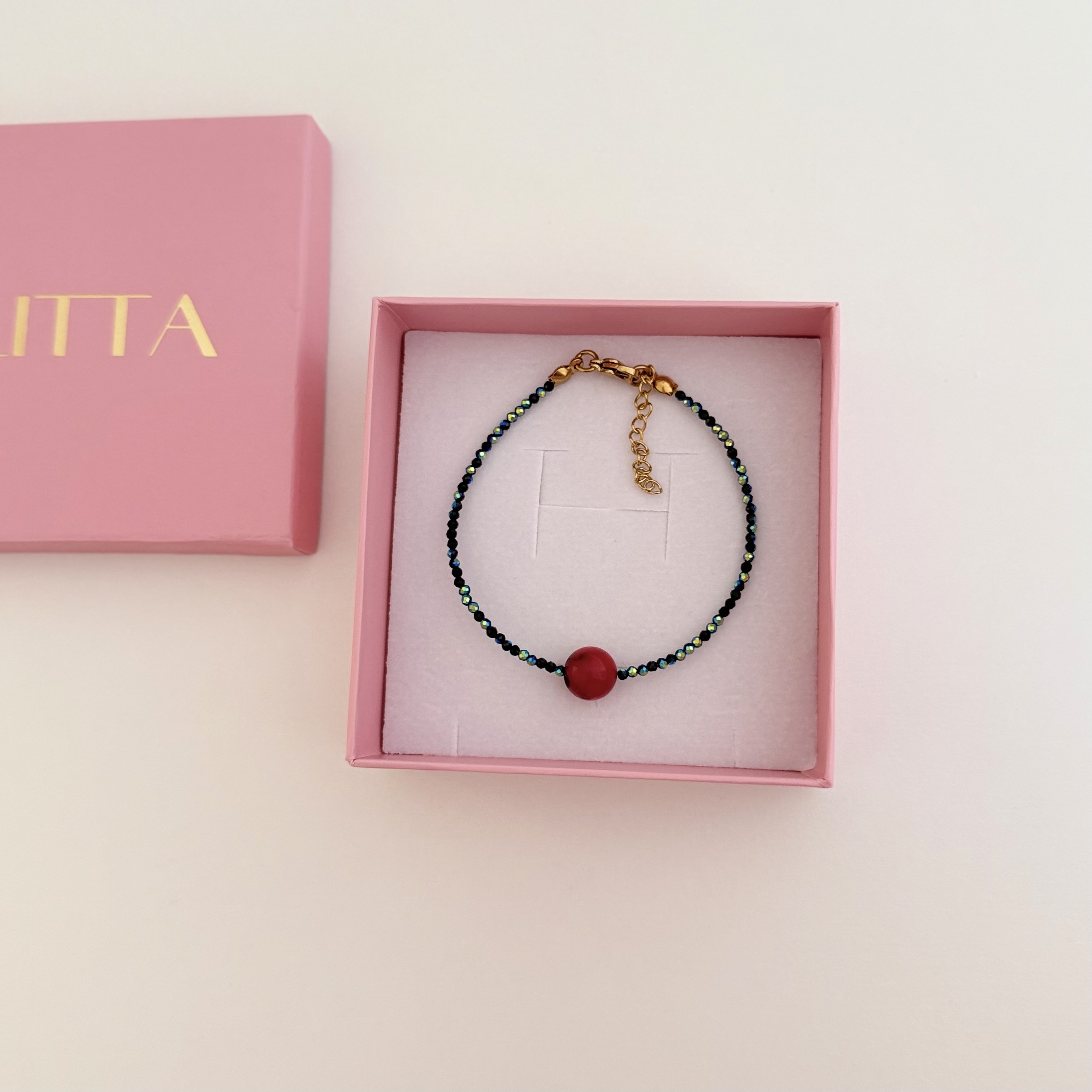 U centru se nalazi crveni koral, koji unosi upečatljiv kontrast i daje posebnu notu ovom komadu. Idealna je za one koji vole jednostavan dizajn sa efektnim detaljem. Materijal: kristali i koral Dužina: 19cm + 3cm Izrada: ručni rad Narukvica dolazi u brendiranoj poklon kutiji.