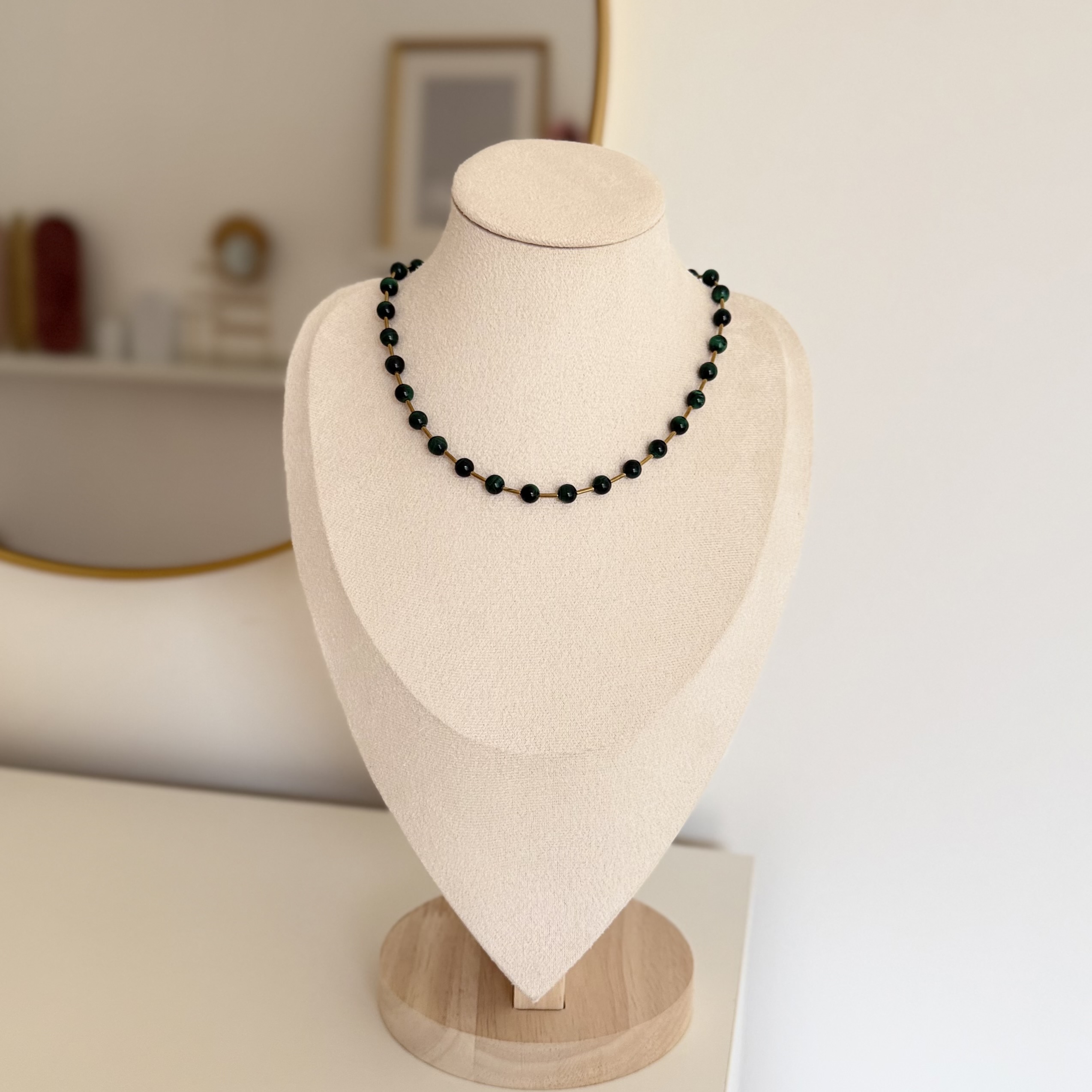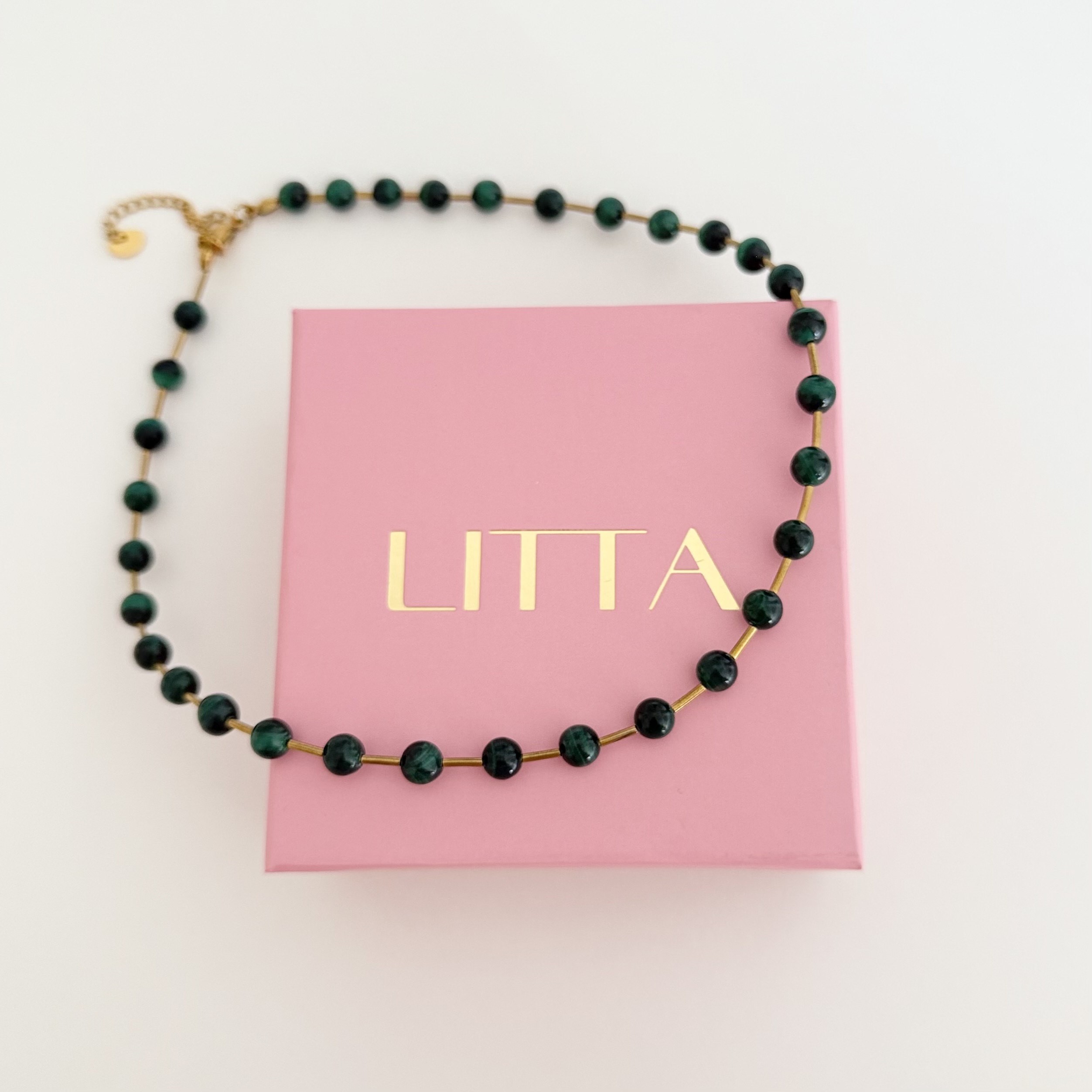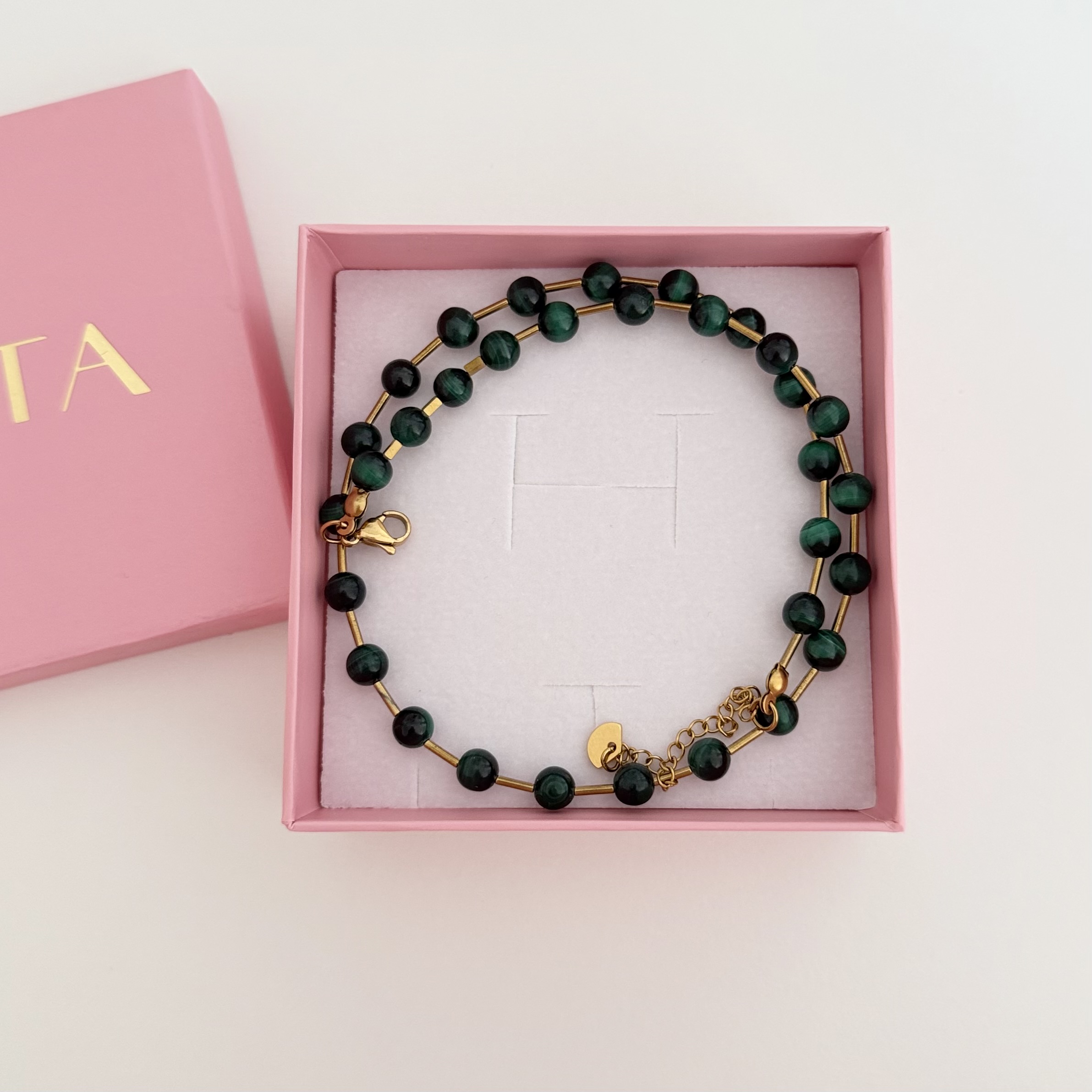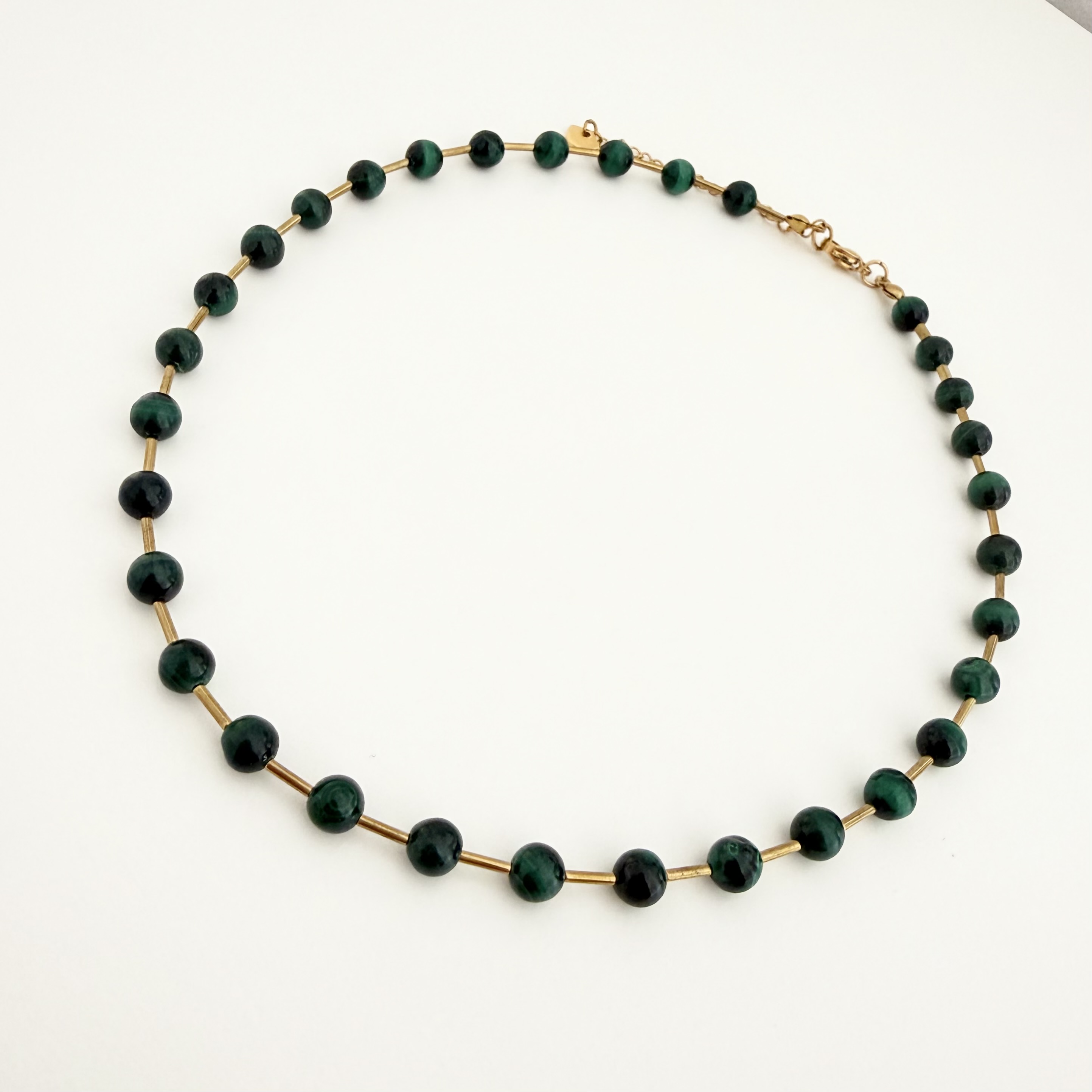 Elegantna ogrlica izrađena od prirodnog malahita sa zlatnim hematitom između.