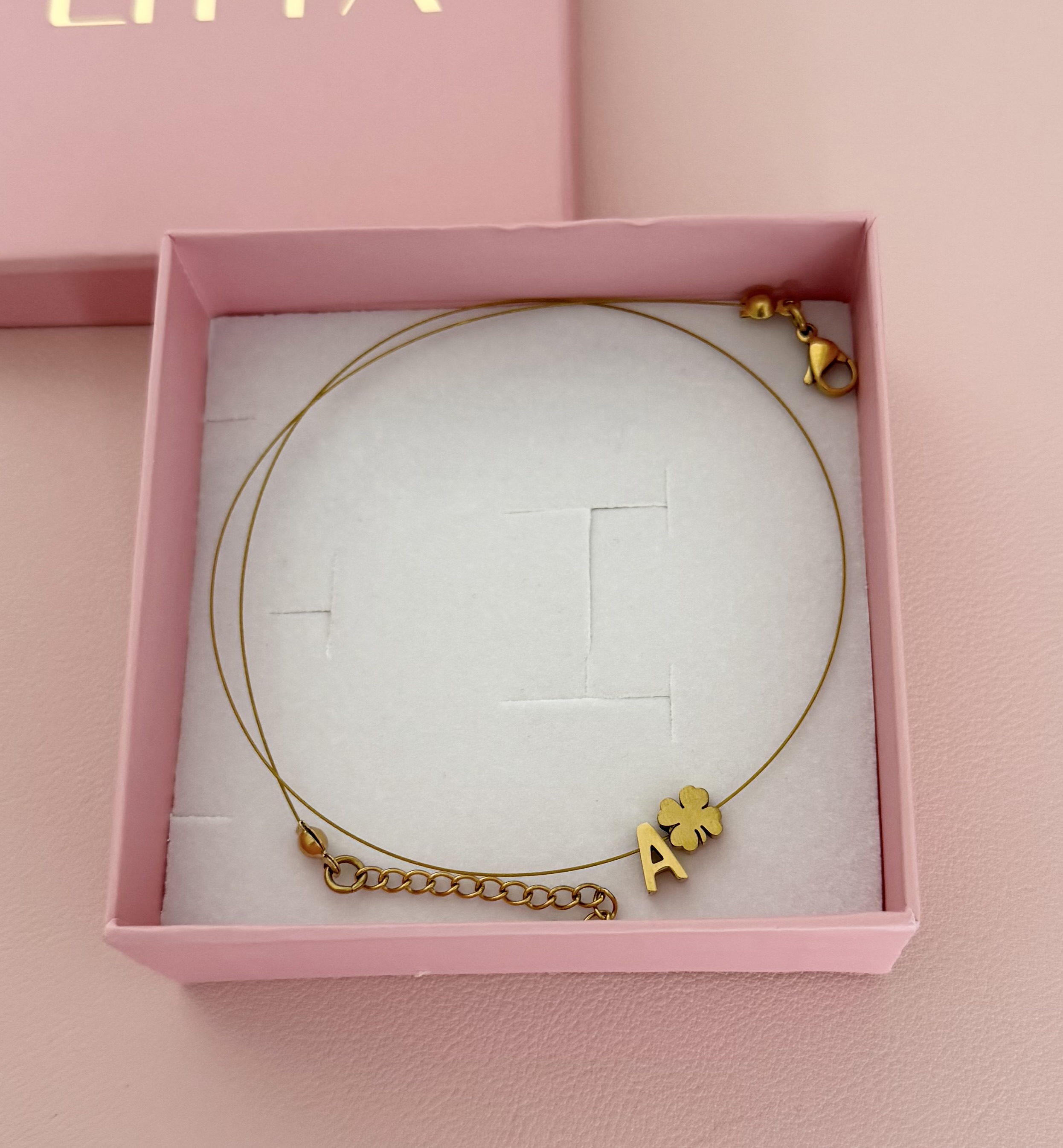 Elegantna sajlica sa inicijalom po tvojoj želji, upotpunjena priveskom deteline, univerzalnim simbolom sreće, zaštite i dobroh početaka. Zlatna boja donosi toplinu i luksuz, čineći ovaj komad savršenim detaljem koji se nosi svakog dana, ali i pamti zauvek. Diskretna, a upečatljiva. Lična, a bezvremenska. Idealan izbor kada želiš nakit koji ima značenje ili poklon koji ostavlja utisak. VAŽNO: Prilikom poručivanja u napomeni obavezno naglasite koje slovo želite. Materijal: nerđajući čelik Dužina ogrlice: 39+5cm Izrada: ručni rad Dolazi u brendiranoj poklon kutiji.