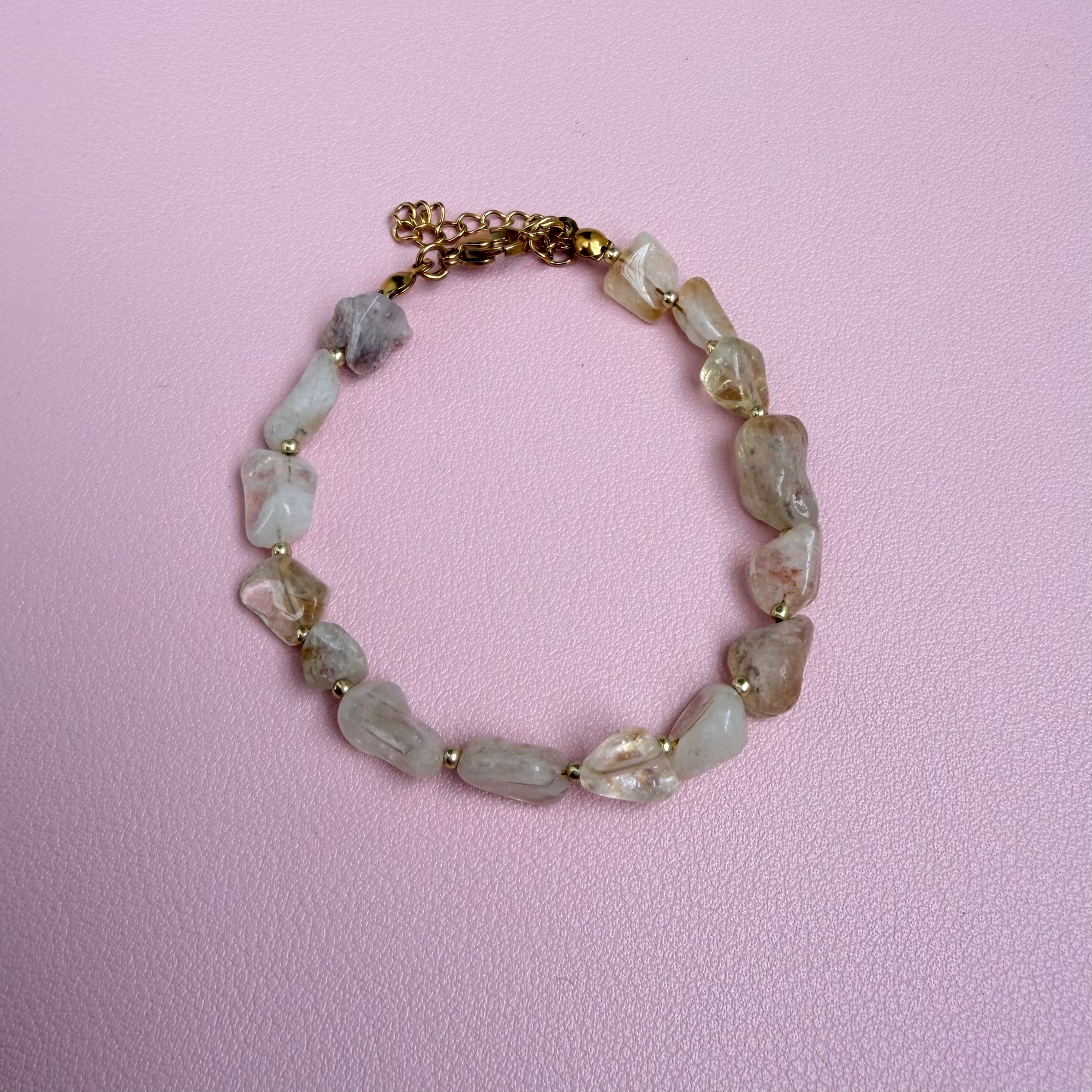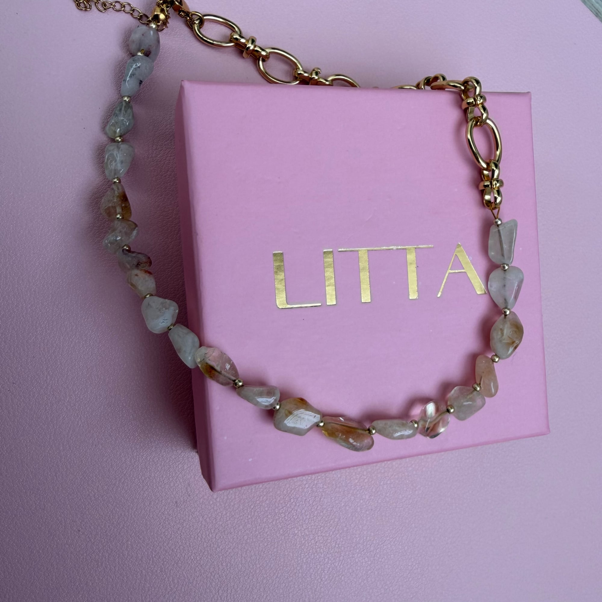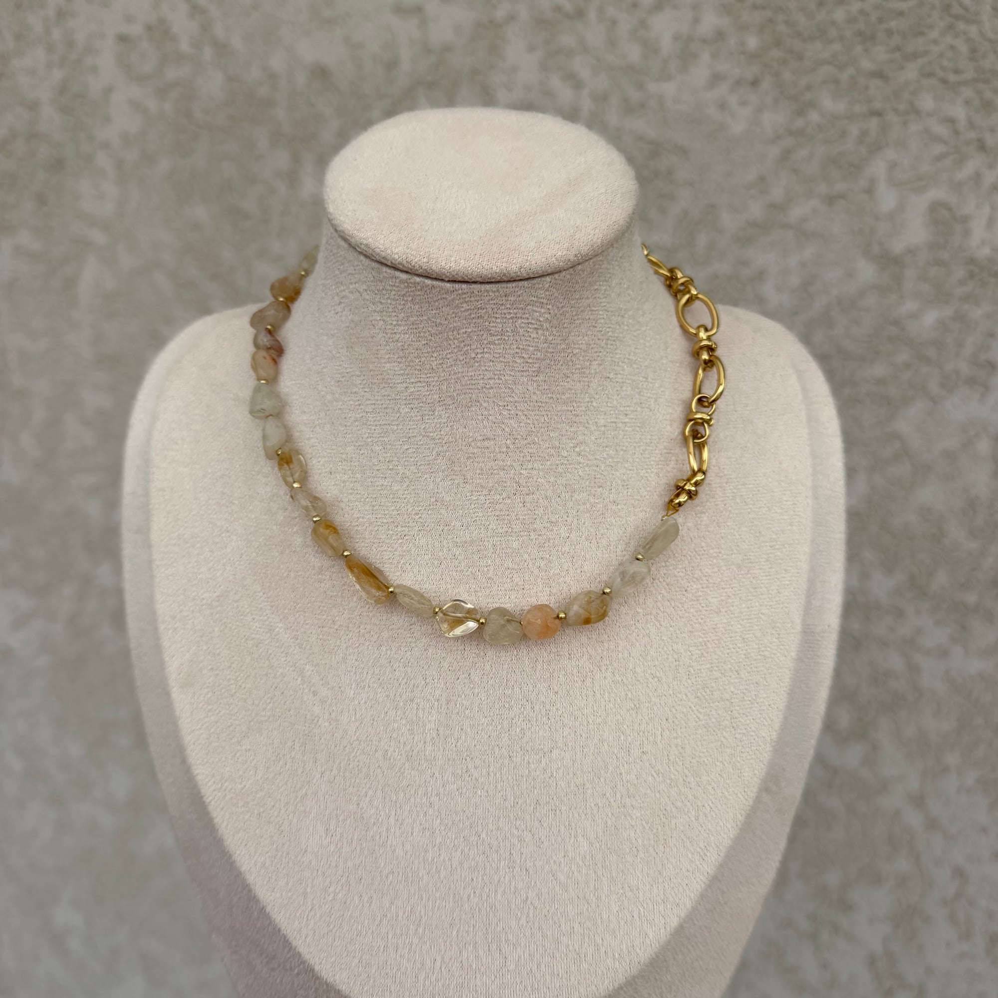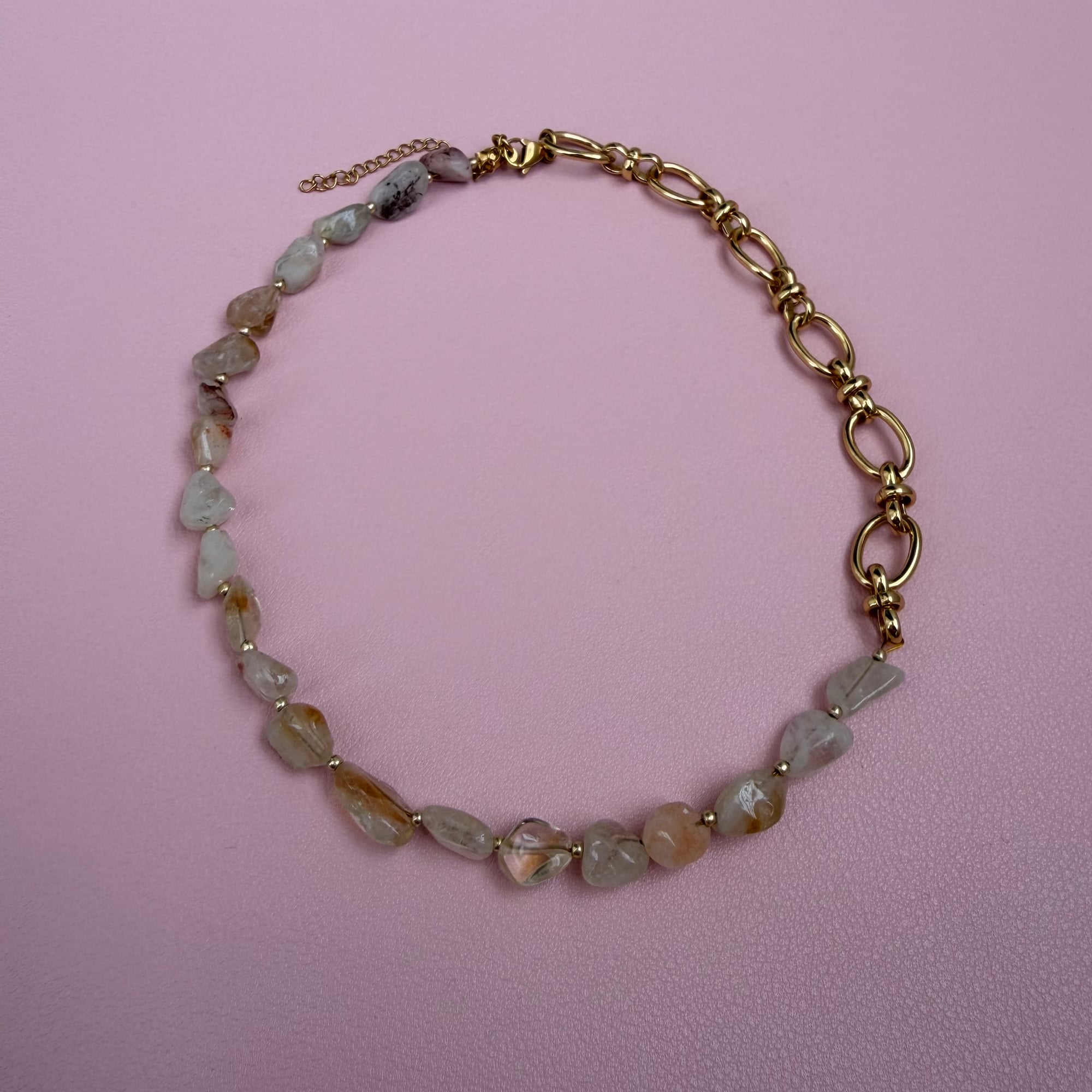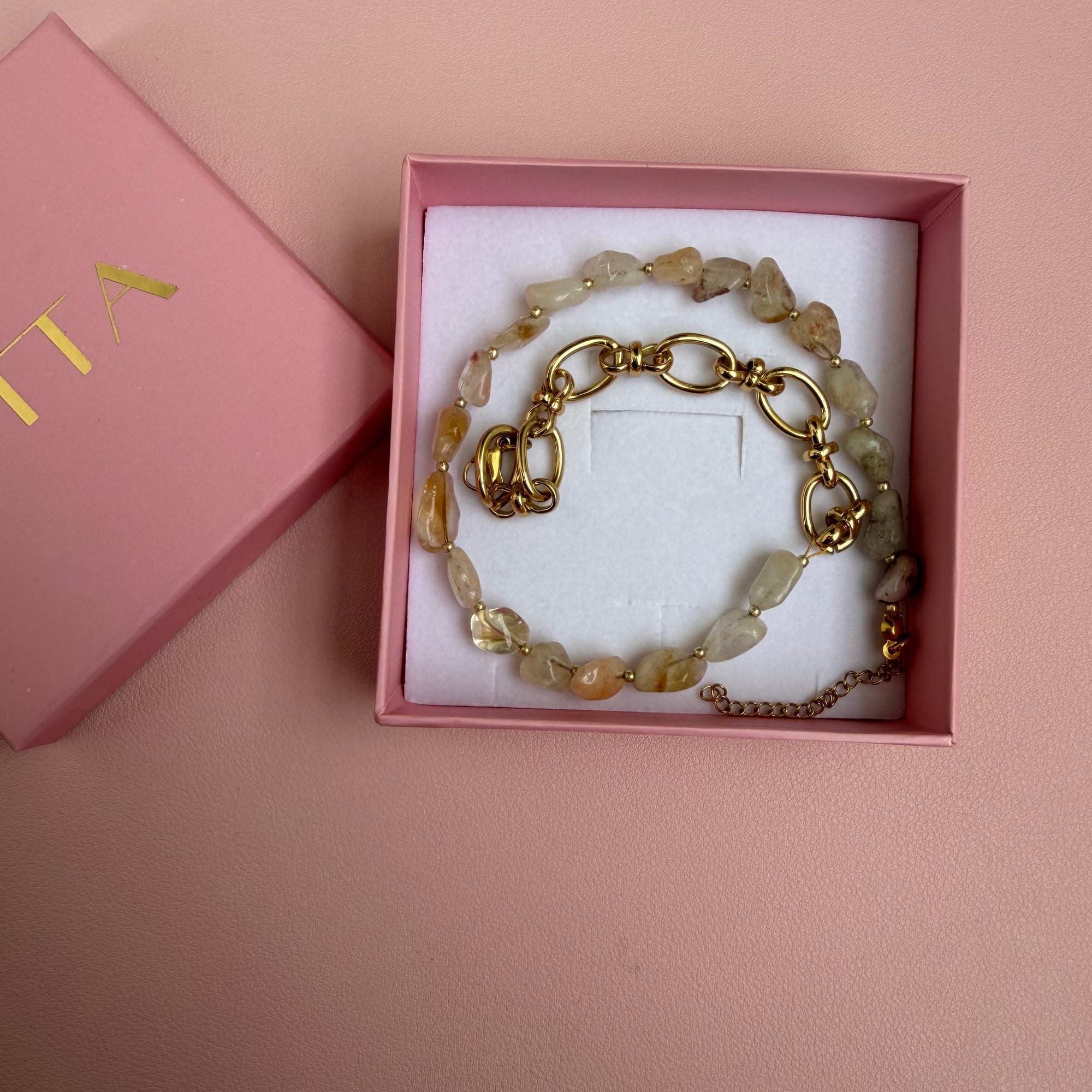 Ova ogrlica je spoj prirodne energije i modernog dizajna. Polovina je izrađena od prirodnog citrina, kamena topline i obilja, dok drugu polovinu čini upečatljiv, deblji lanac od nerđajućeg čelika u zlatnoj boji. Kontrast između nežnog, svetlucavog citrina i snažnog zlatnog lanca simbolizuje balans — mekoću i odlučnost, intuiciju i akciju, ženstvenost i moć.