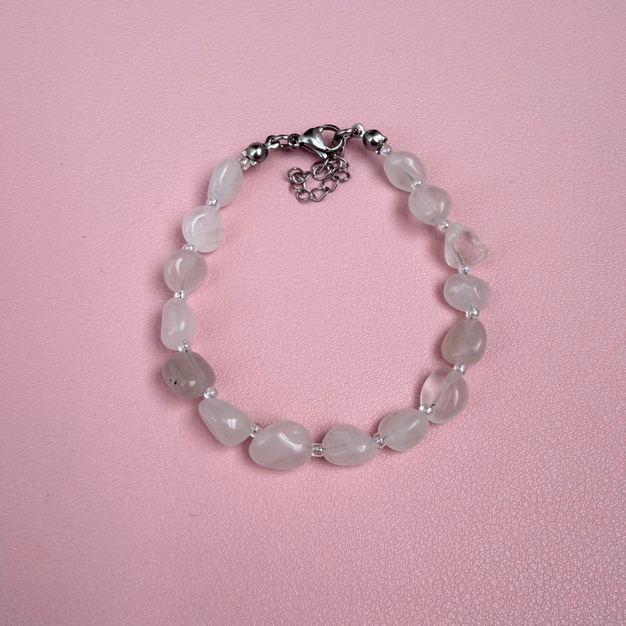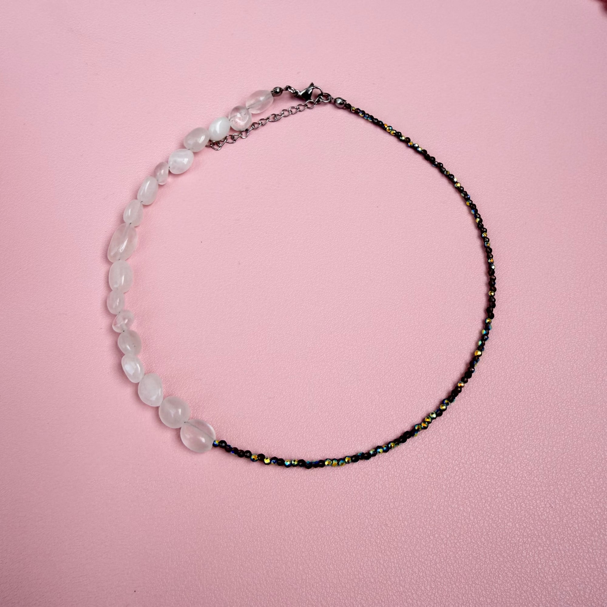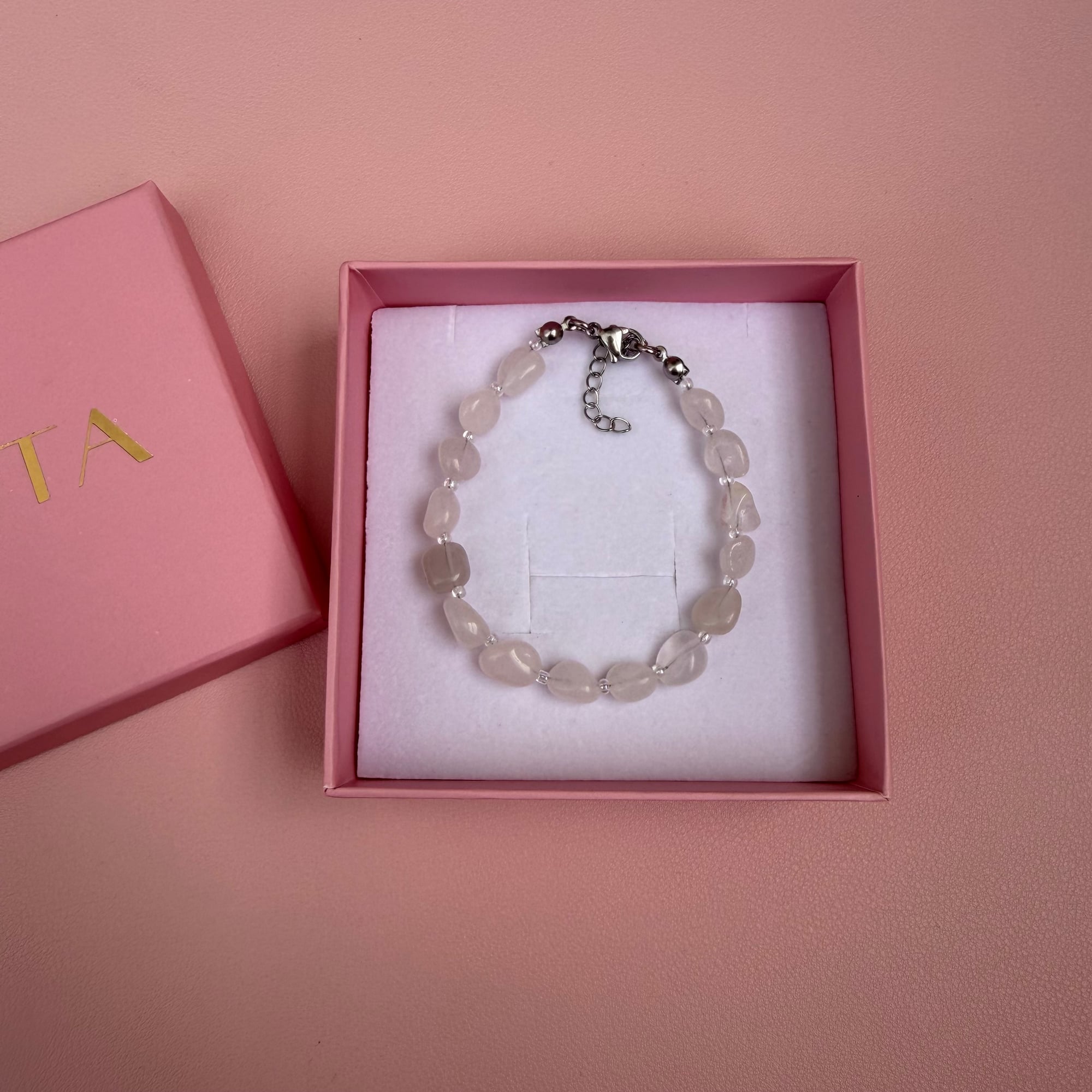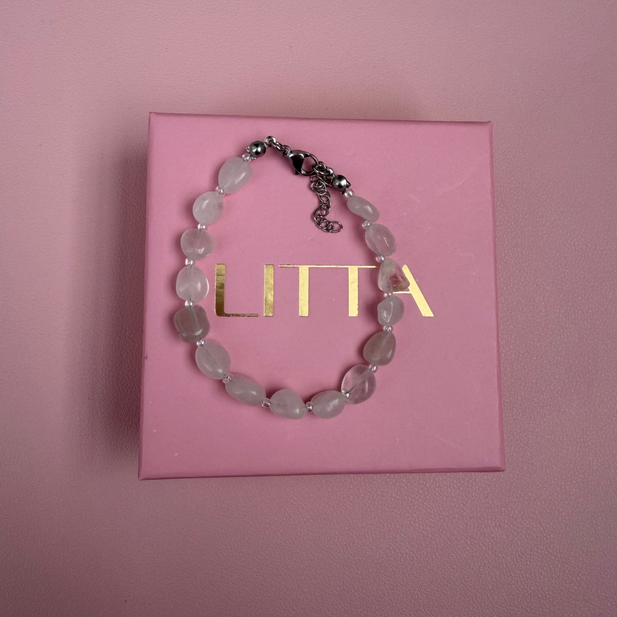 Narukvica je izrađena od kvarca, a između svakog kamena nalazi se sitna perlica u srebrno-prozirnoj nijansi koja daje diskretan ritam i suptilan sjaj. Kvarc simbolizuje balans, jasnoću i pojačanu energiju. Njegova neutralna, svetla estetika čini ga savršenim komadom za svakodnevno nošenje – lako se kombinuje, ali uvek izgleda posebno.