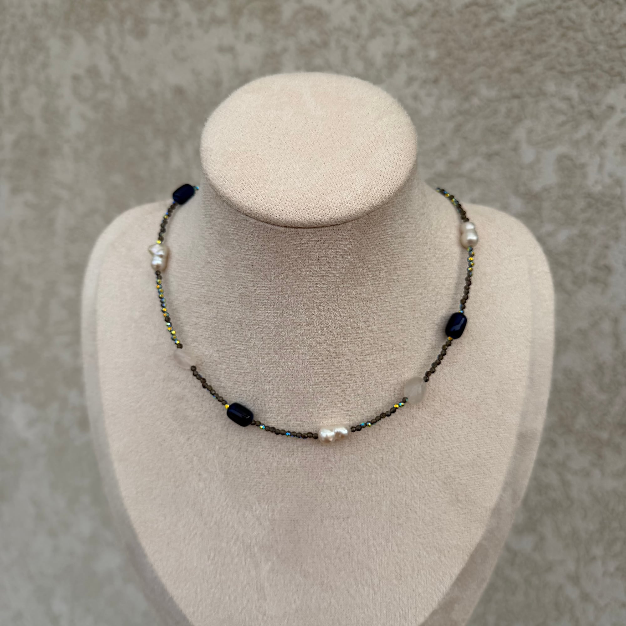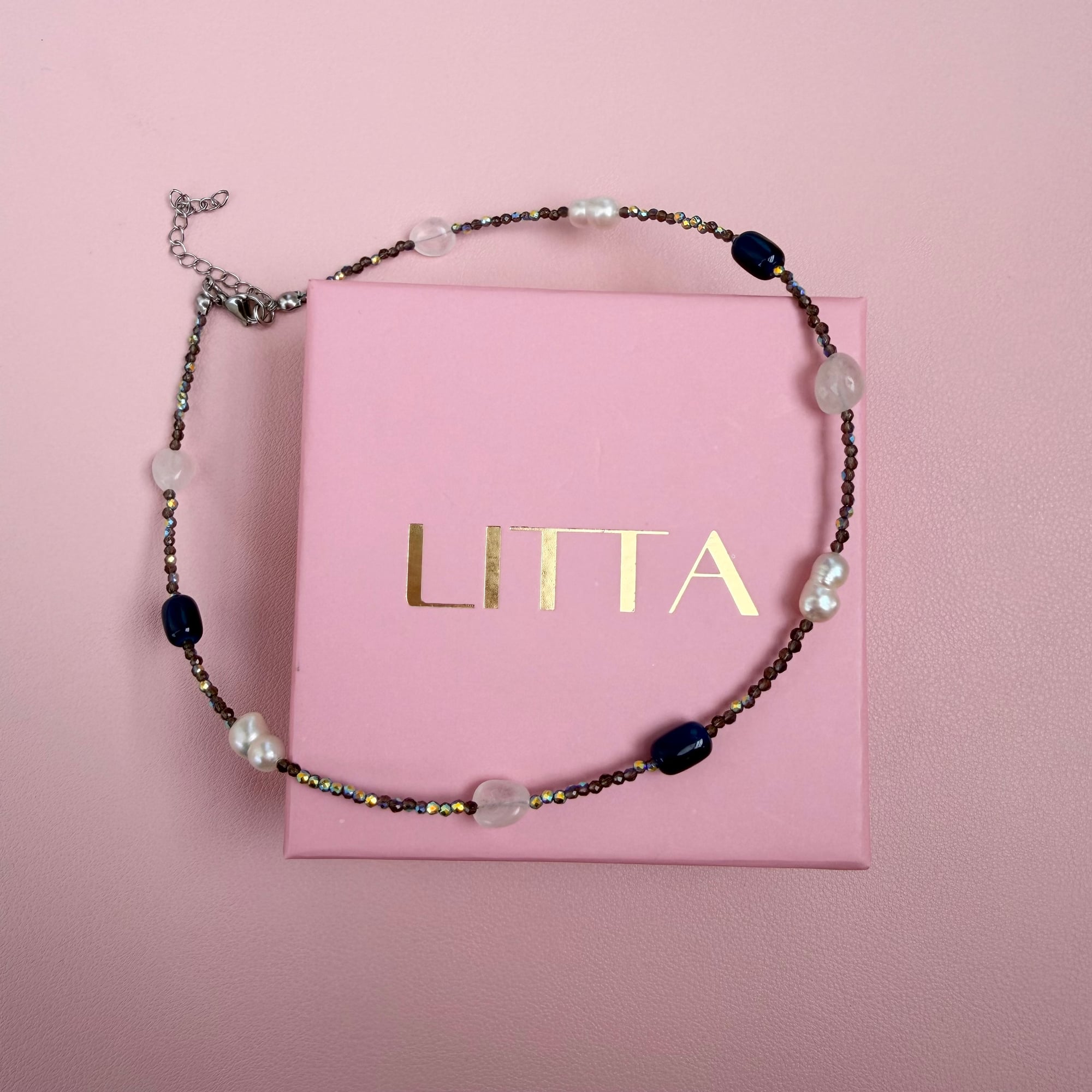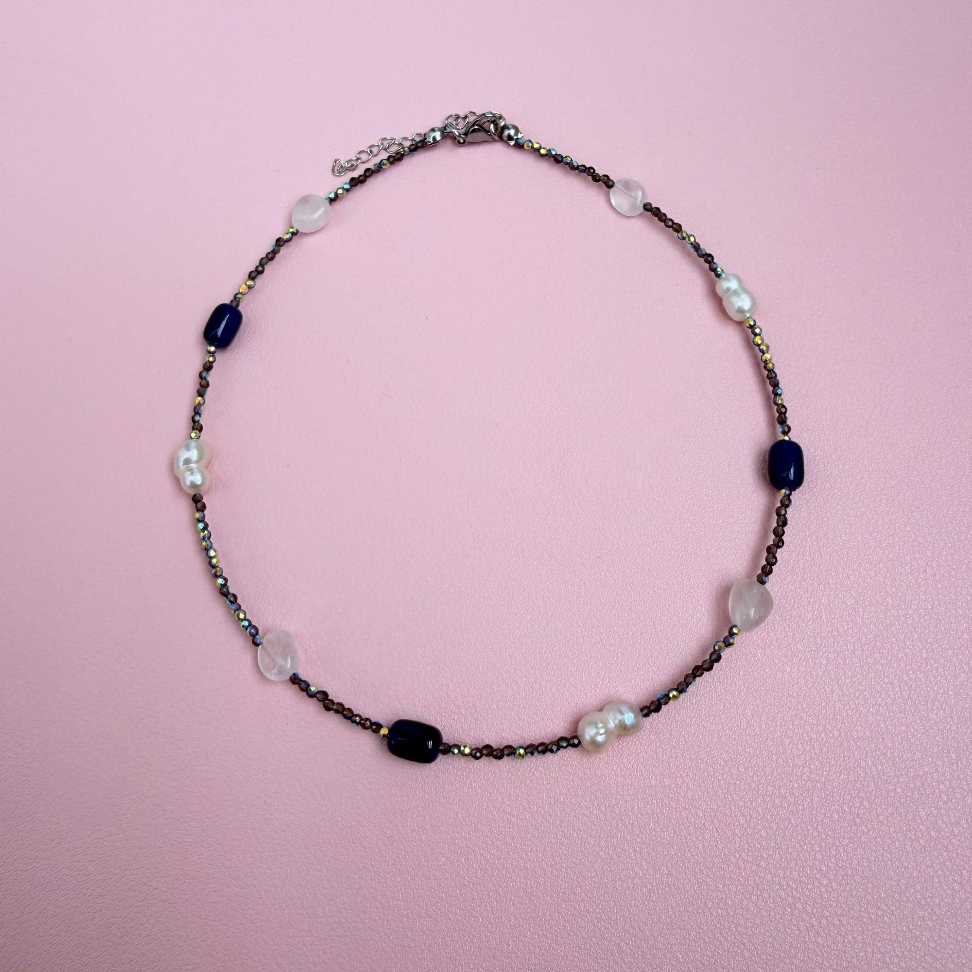 Delikatna i pažljivo osmišljena ogrlica izrađena od najsitnijih kristala, sa ponekim prirodnim kvarcom, slatkovodnim biserom i teget perlama. Ova kombinacija stvara suptilan sjaj i sofisticiranu teksturu, dok različiti materijali daju dubinu i posebnost svakom detalju.