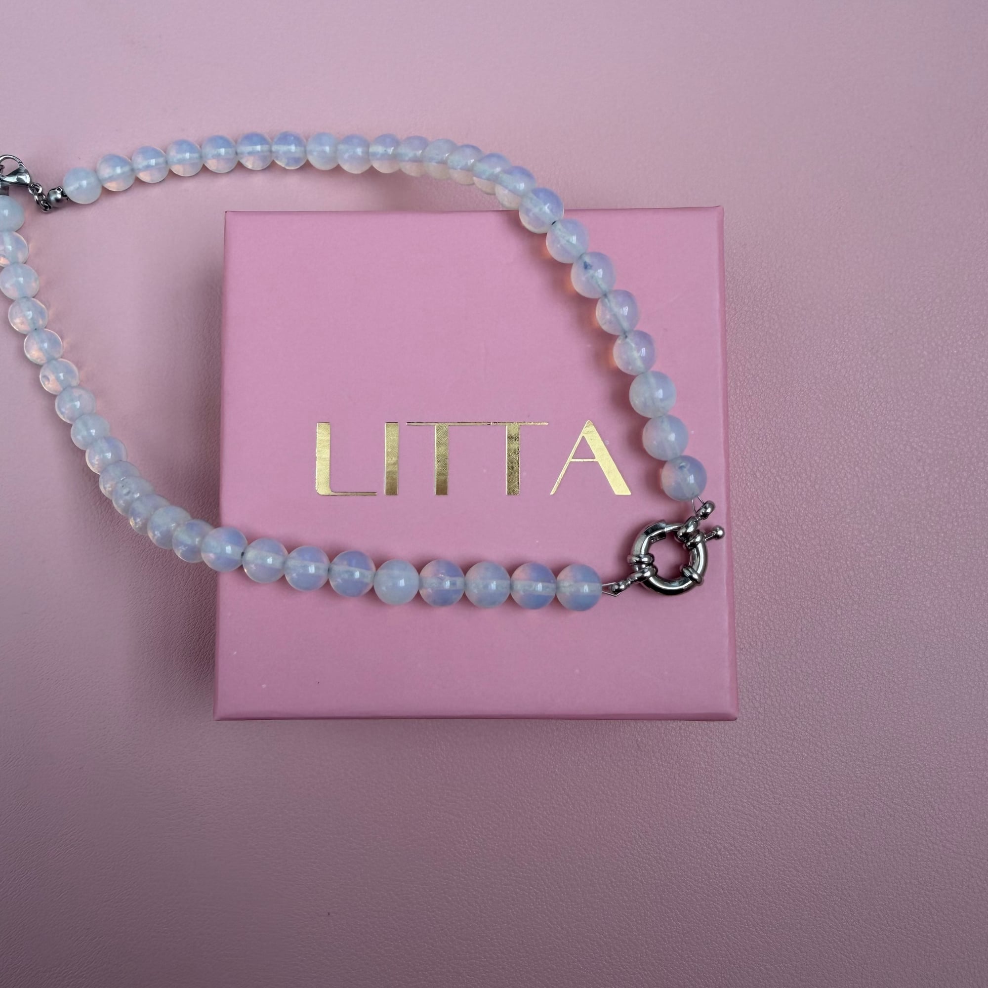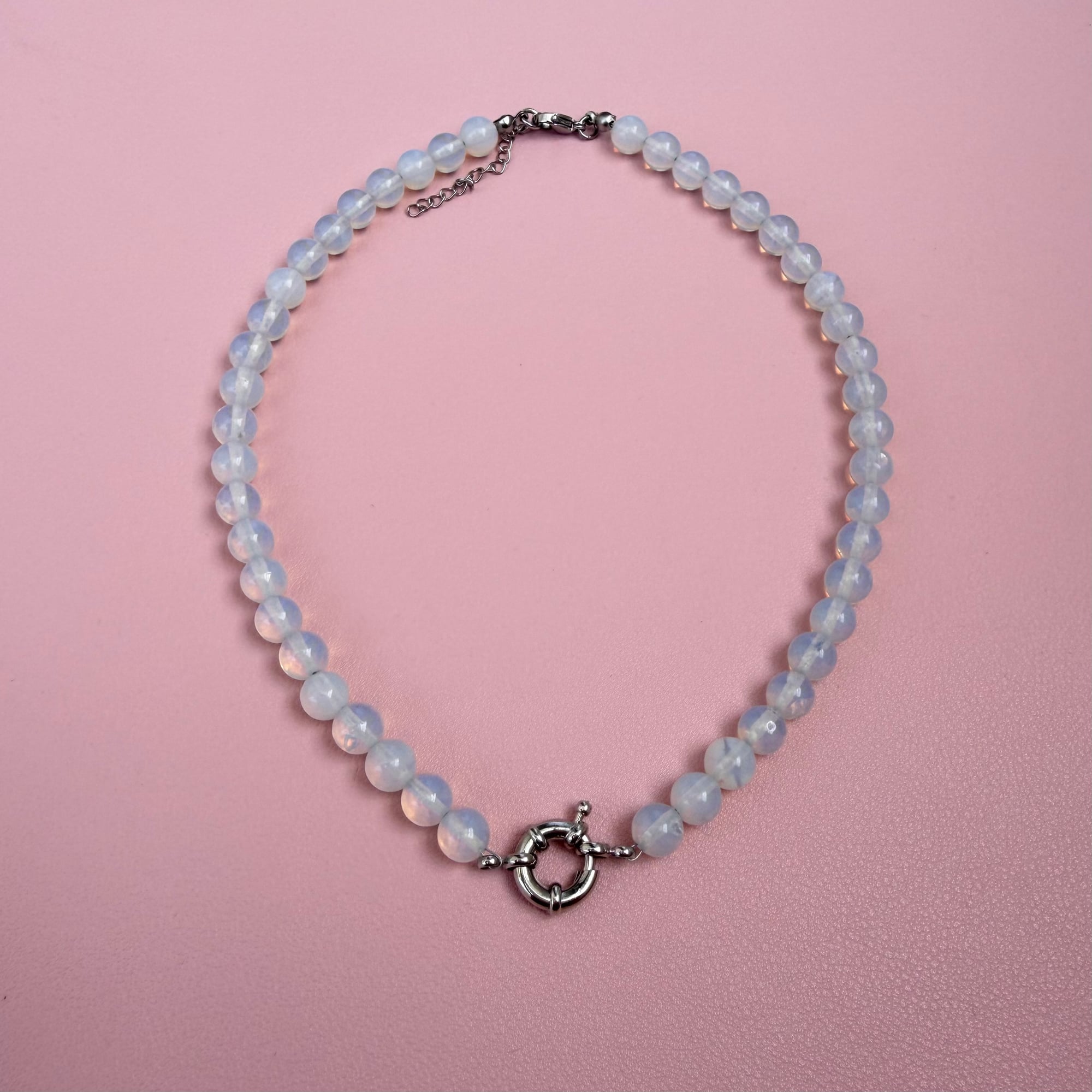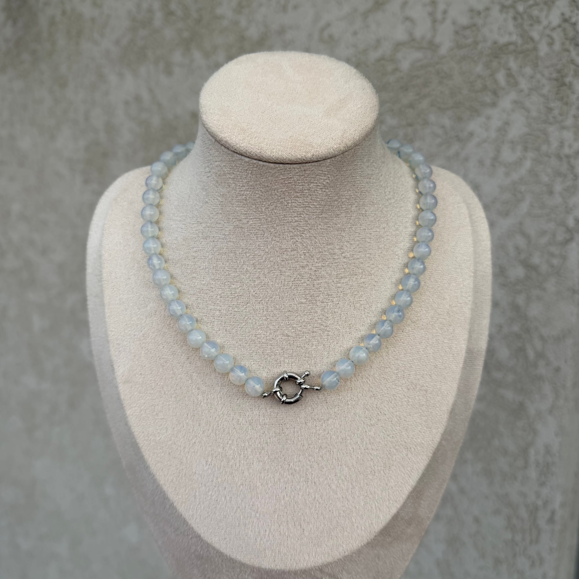 Elegantna i svetlucava ogrlica izrađena od opalita, sa modernom srebrnom kopčom od nerđajućeg čelika kao centralnim i funkcionalnim detaljem. Minimalistički dizajn u kombinaciji sa suptilnim sjajem opalita daje ovom komadu nežan, ali prepoznatljiv izgled. Opalit je poznat po svom blagom, mlečno-providnom sjaju koji podseća na mesečinu. Simbolizuje smirenost, unutrašnju jasnoću i emotivnu ravnotežu. Često se povezuje sa nežnom energijom, intuicijom i pozitivnim mislima. Njegov diskretan sjaj čini ga savršenim izborom za žene koje vole suptilan, svetao i sofisticiran nakit.