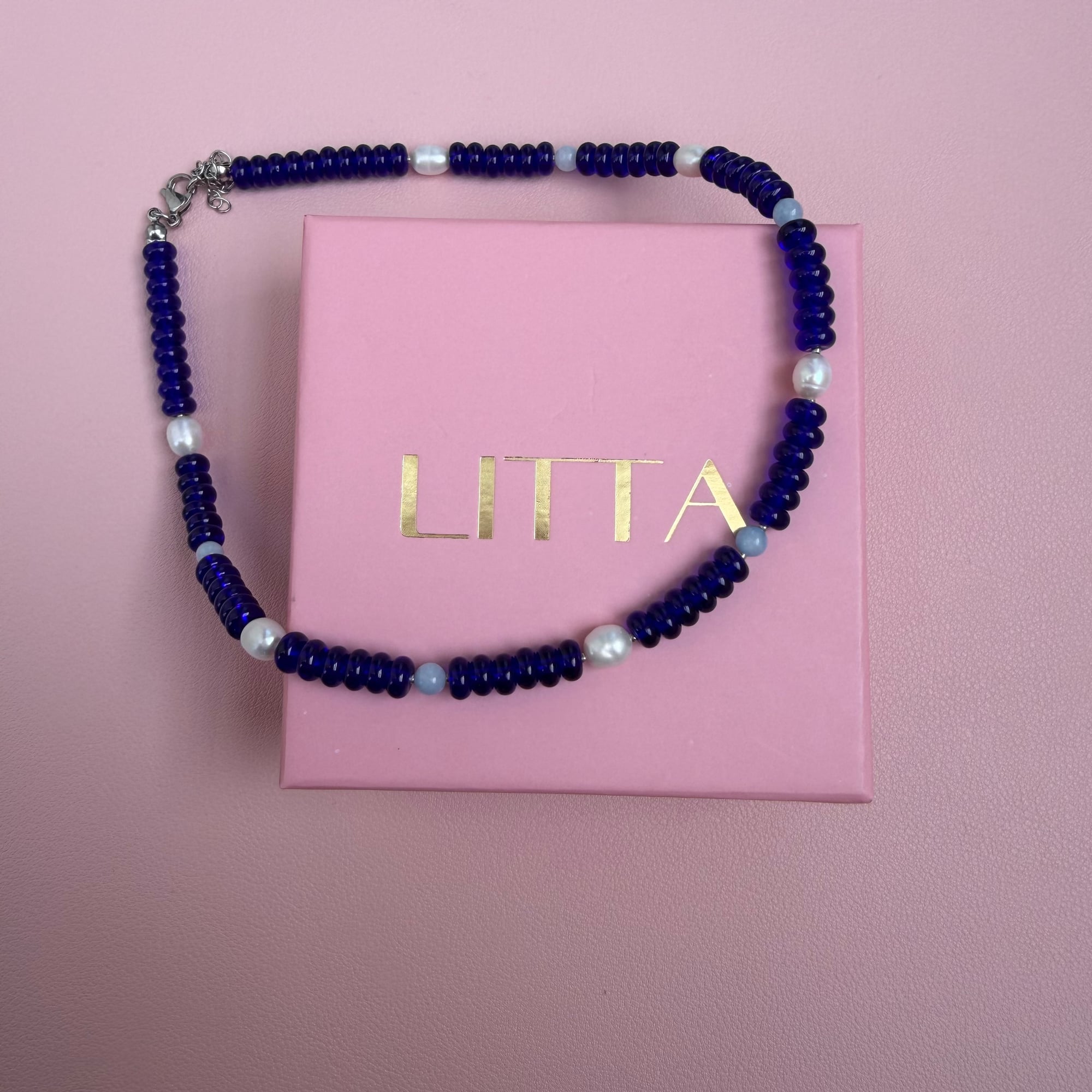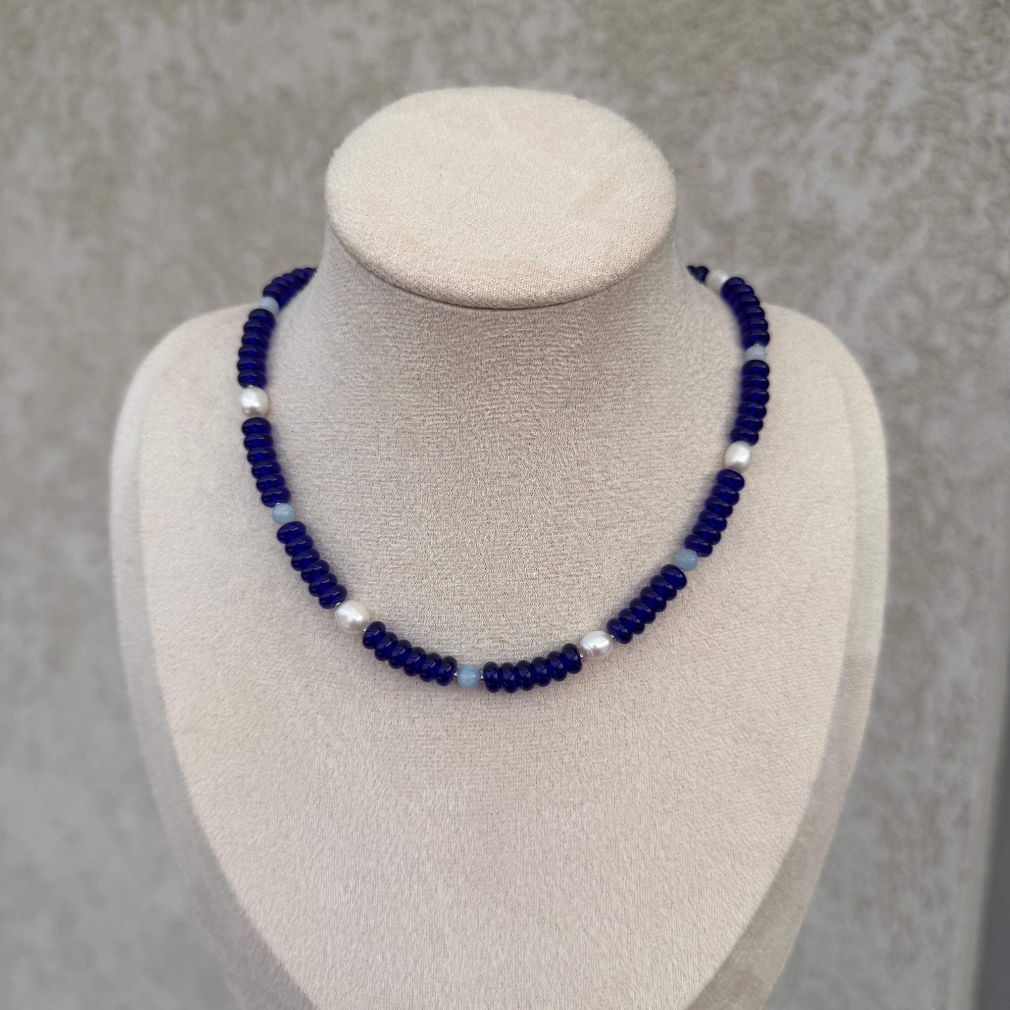 Elegantna ogrlica izrađena od plavih perli, sa pažljivo raspoređenim slatkovodnim biserima i detaljima u svetloplavom sedefu. Kombinacija različitih tekstura i nijansi plave stvara sofisticiran, osvežavajući i harmoničan izgled.