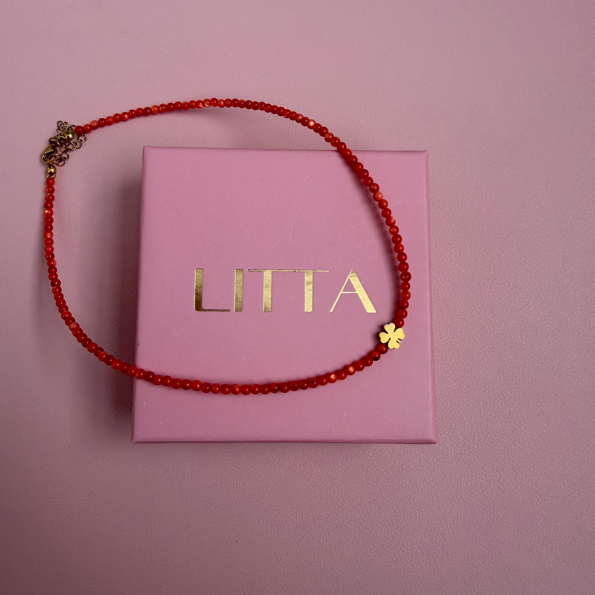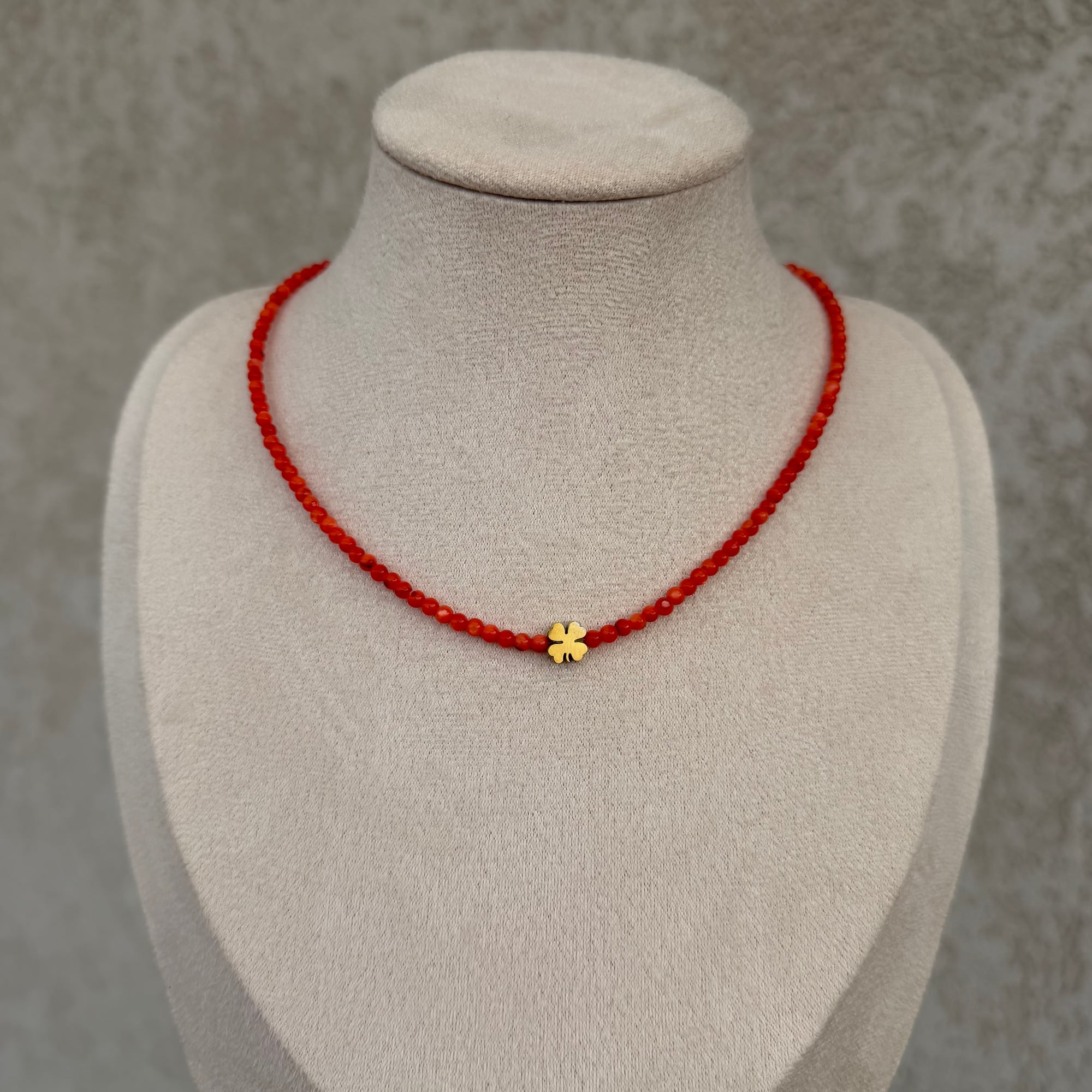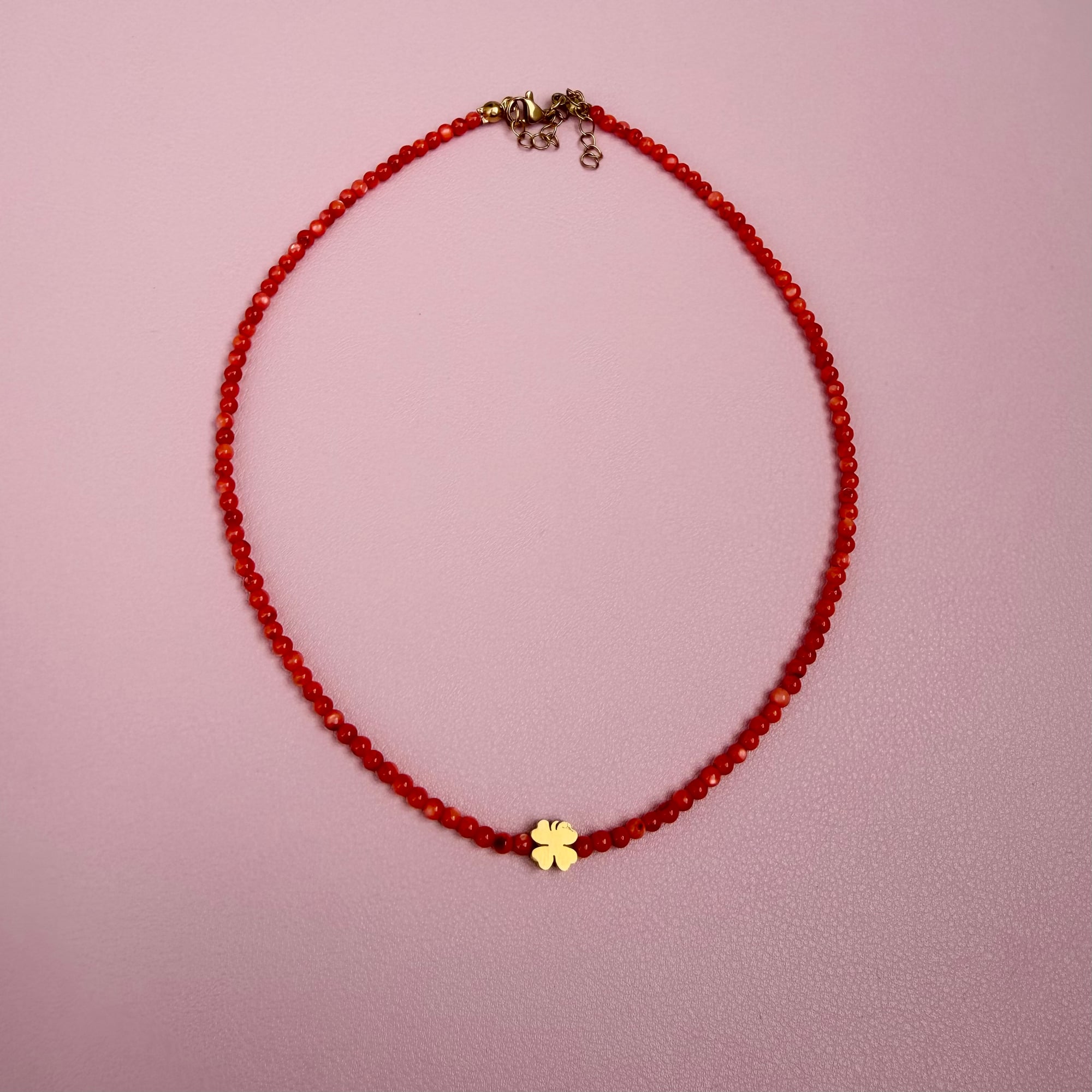 Ogrlica od crvenog sedefa sa zlatnom detelinom