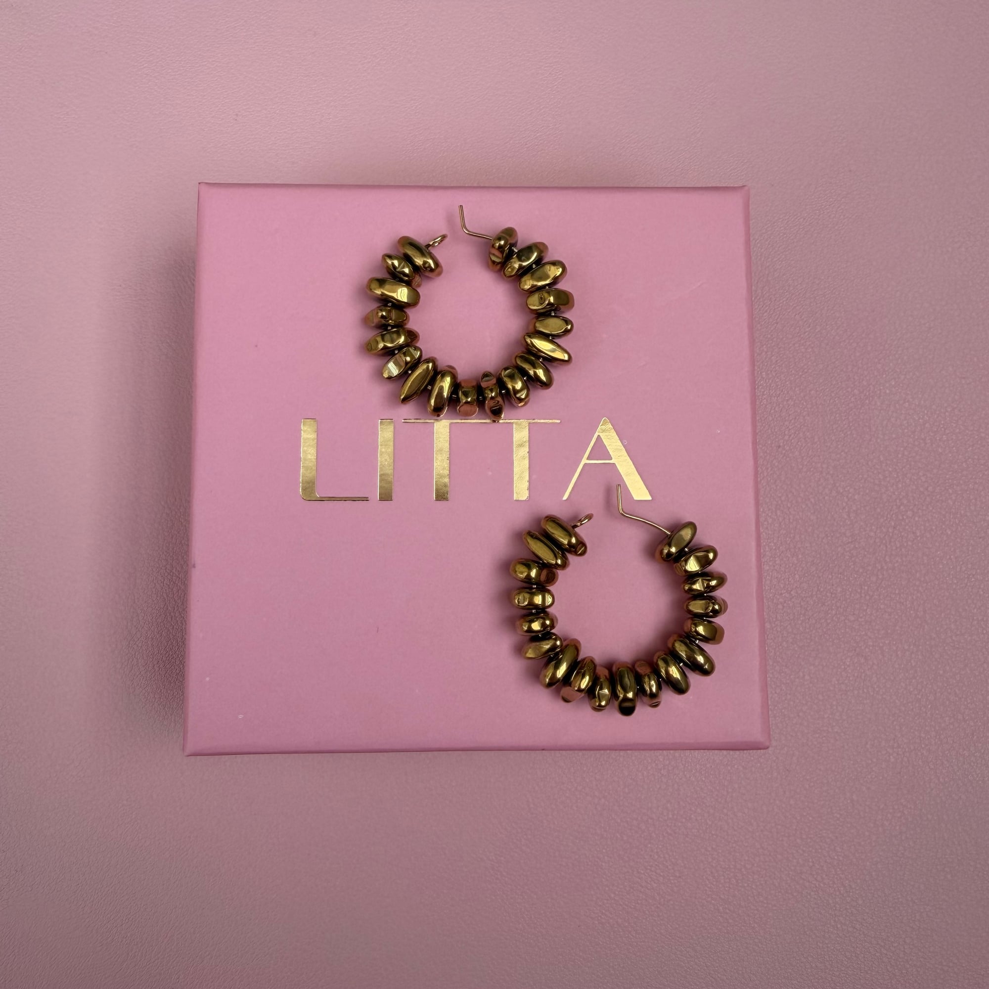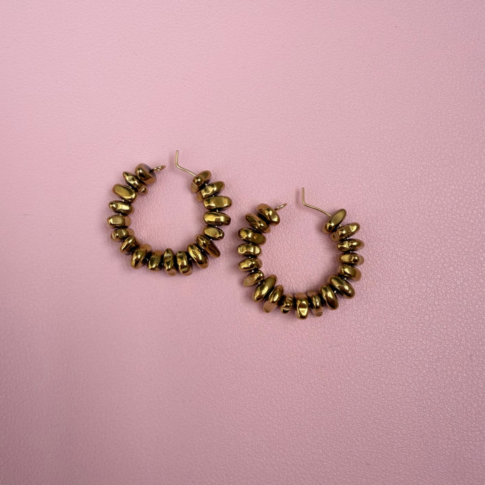 Modernе alke izrađene od zlatnog hematita nepravilnog oblika. Njihova tekstura i oblik daju nakitu posebnu dinamiku i autentičan izgled, dok zlatni ton donosi eleganciju i luksuzni sjaj.