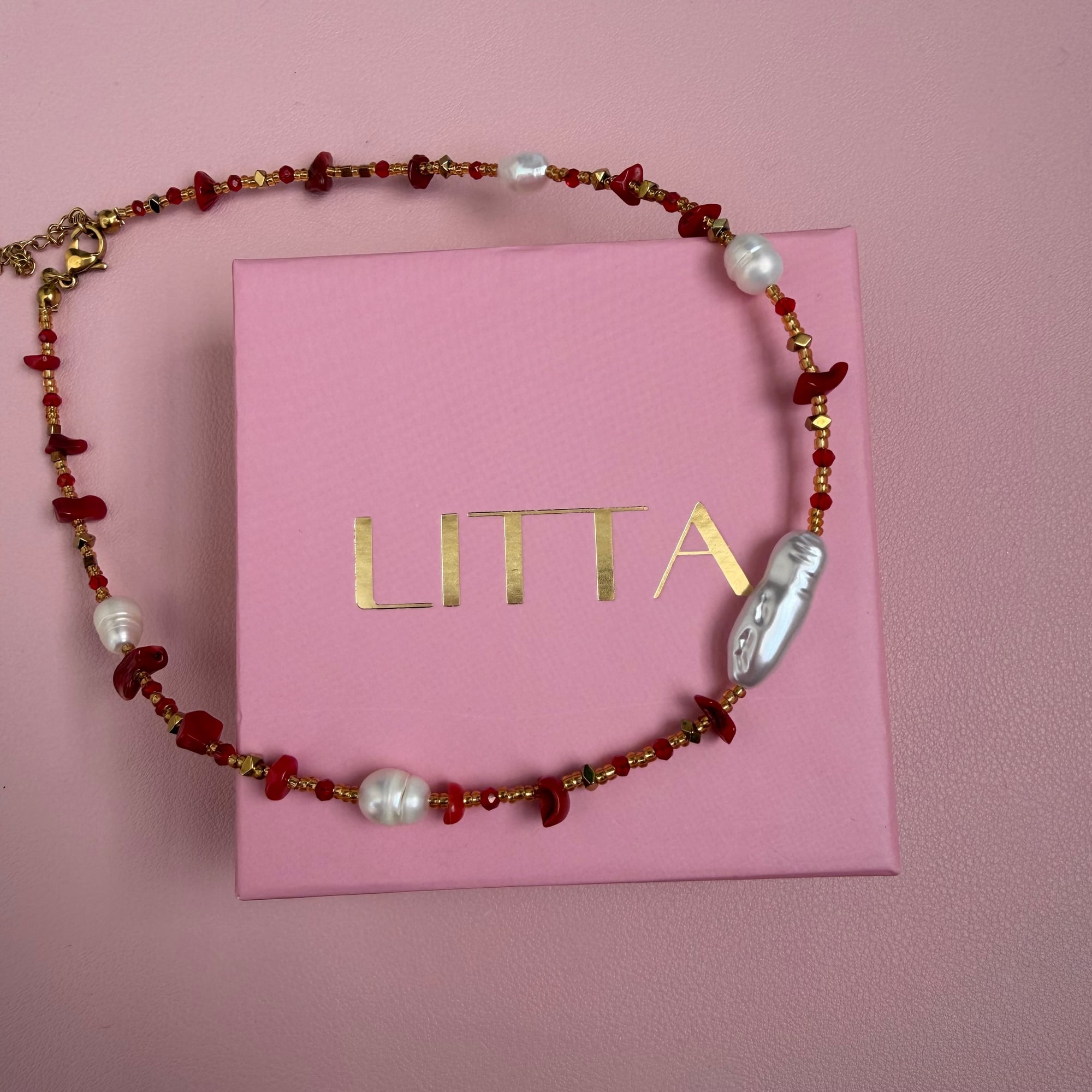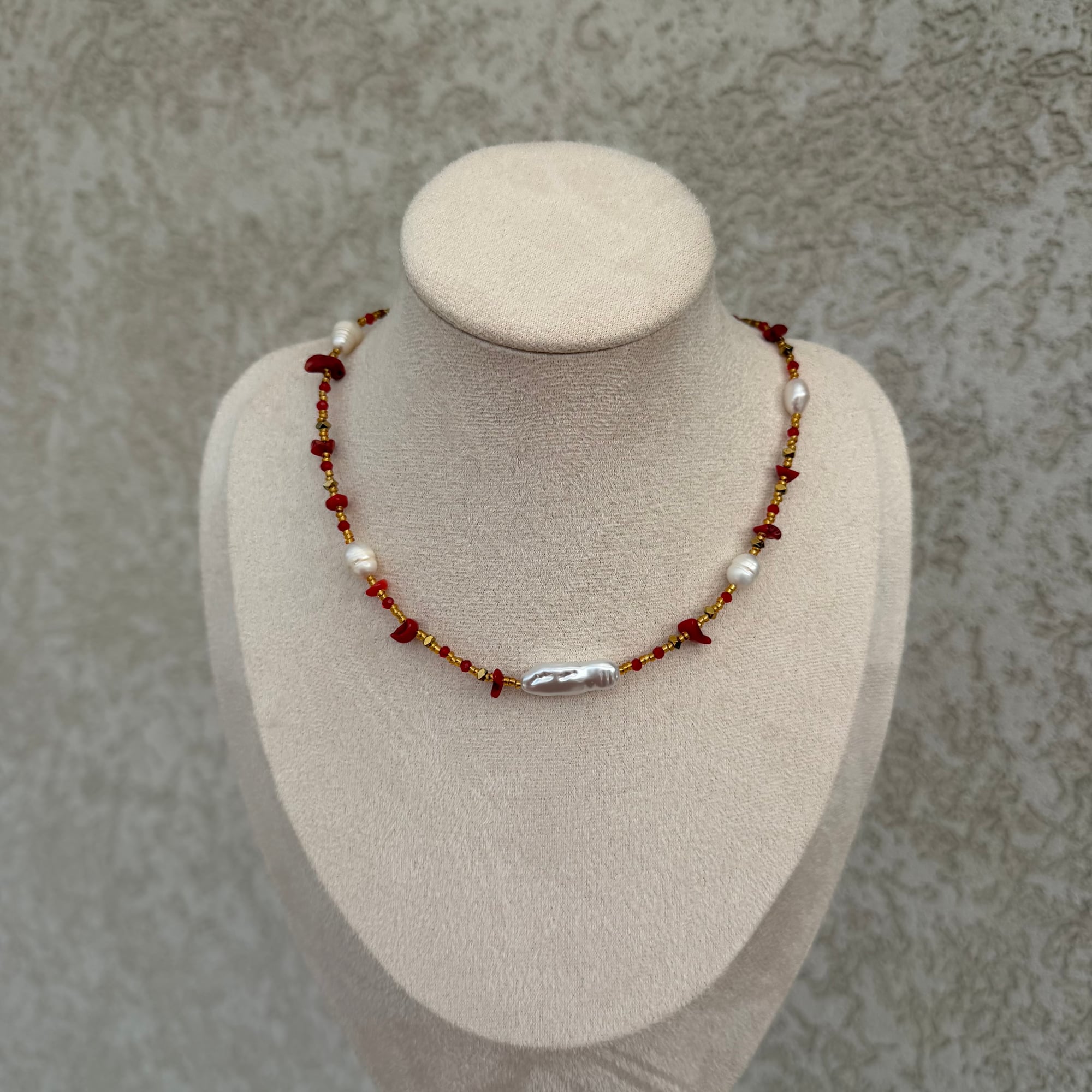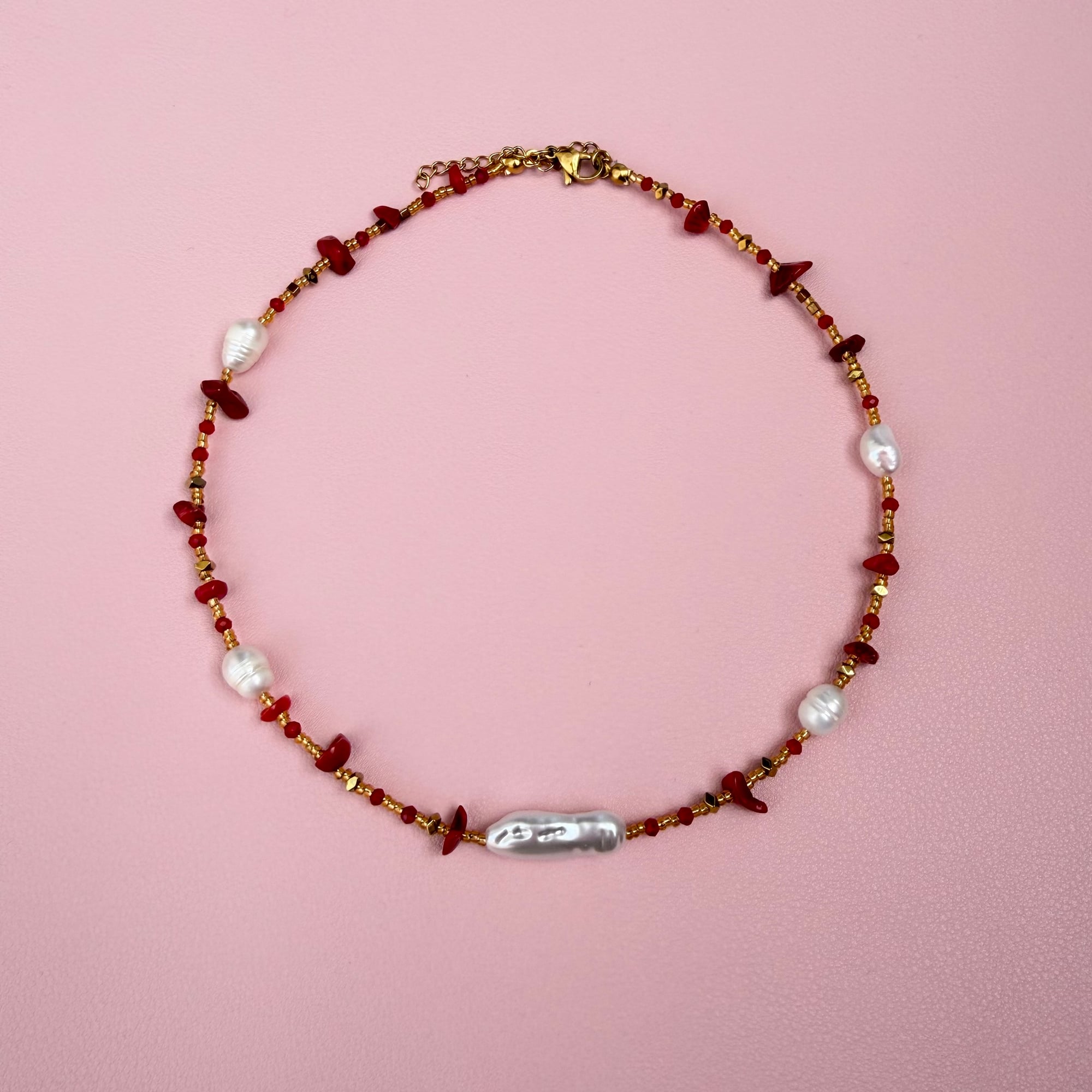 Posebna i pažljivo izrađena ogrlica od sitnih zlatnih perlica, sa crvenim detaljima od korala i prirodnim slatkovodnim biserima. Ova kombinacija stvara luksuzan, ali nežan izgled, u kojem se prepliću toplina zlata, energija crvene boje i elegancija bisera. Koral simbolizuje životnu energiju, vitalnost i zaštitu, dok njegova crvena nijansa unosi strast i snagu. Slatkovodni biseri donose notu ženstvenosti, čistoće i bezvremenske elegancije. Zajedno sa zlatnim perlicama, ovaj komad odiše sofisticiranošću i pažljivo izbalansiranim kontrastom.