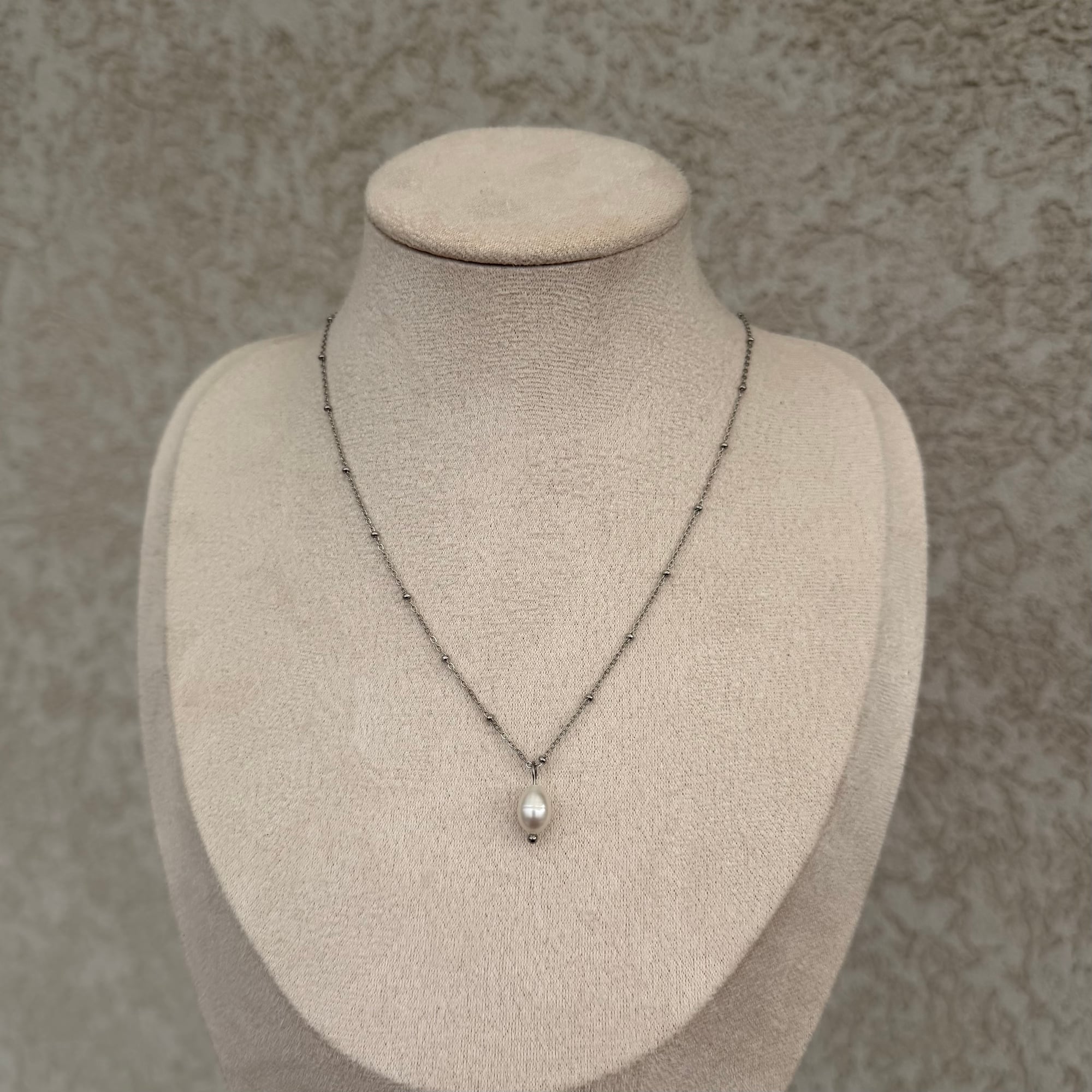 Elegantna srebrna ogrlica sa lančićem ukrašenim sitnim srebrnim perlicama i centralnim priveskom od prirodnog slatkovodnog bisera. Spoj hladnog srebrnog tona i nežnog sjaja bisera stvara bezvremenski, sofisticiran izgled koji se lako uklapa uz svaku kombinaciju.