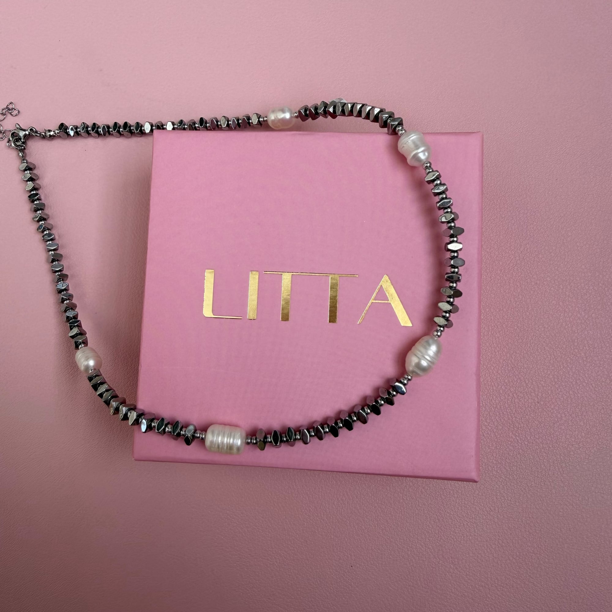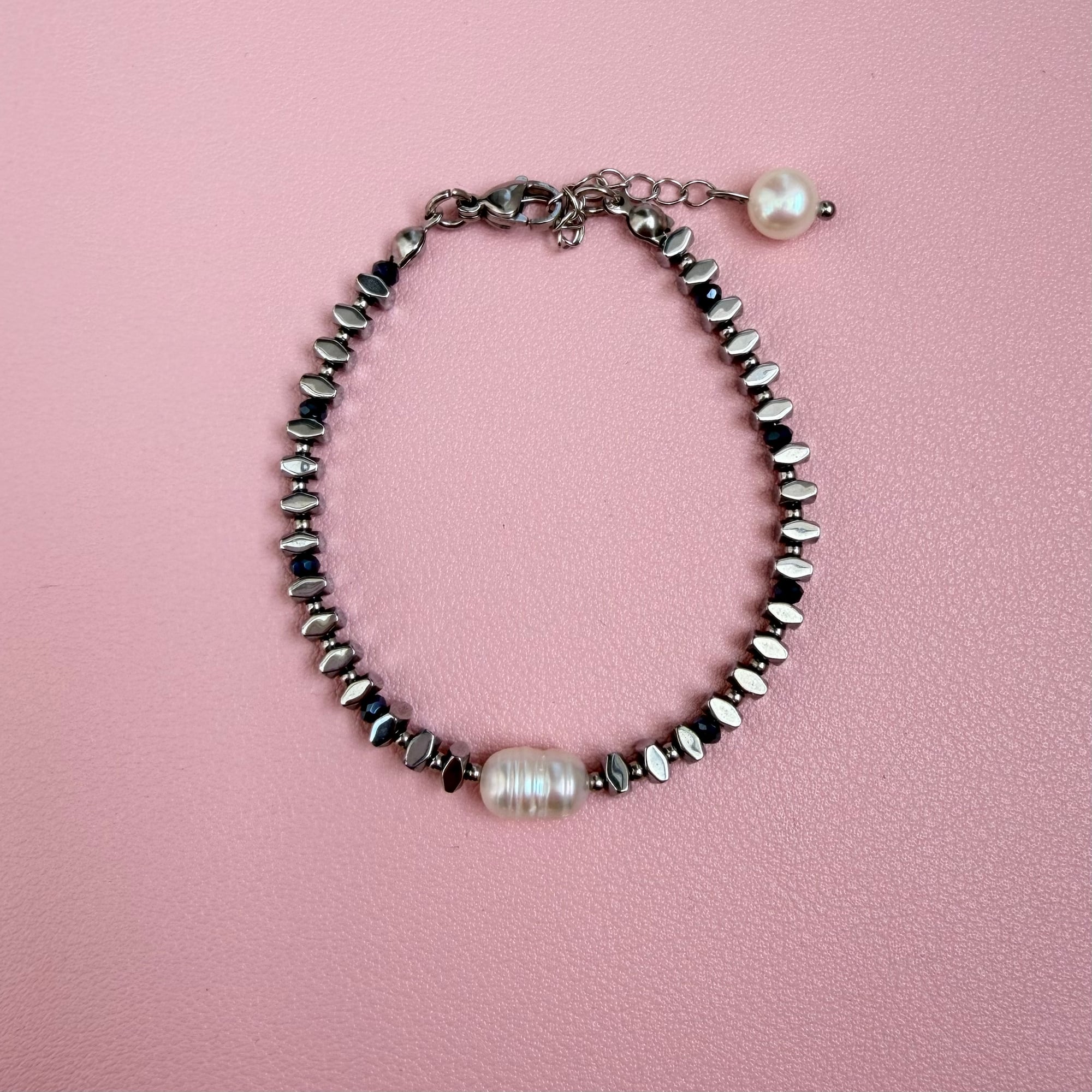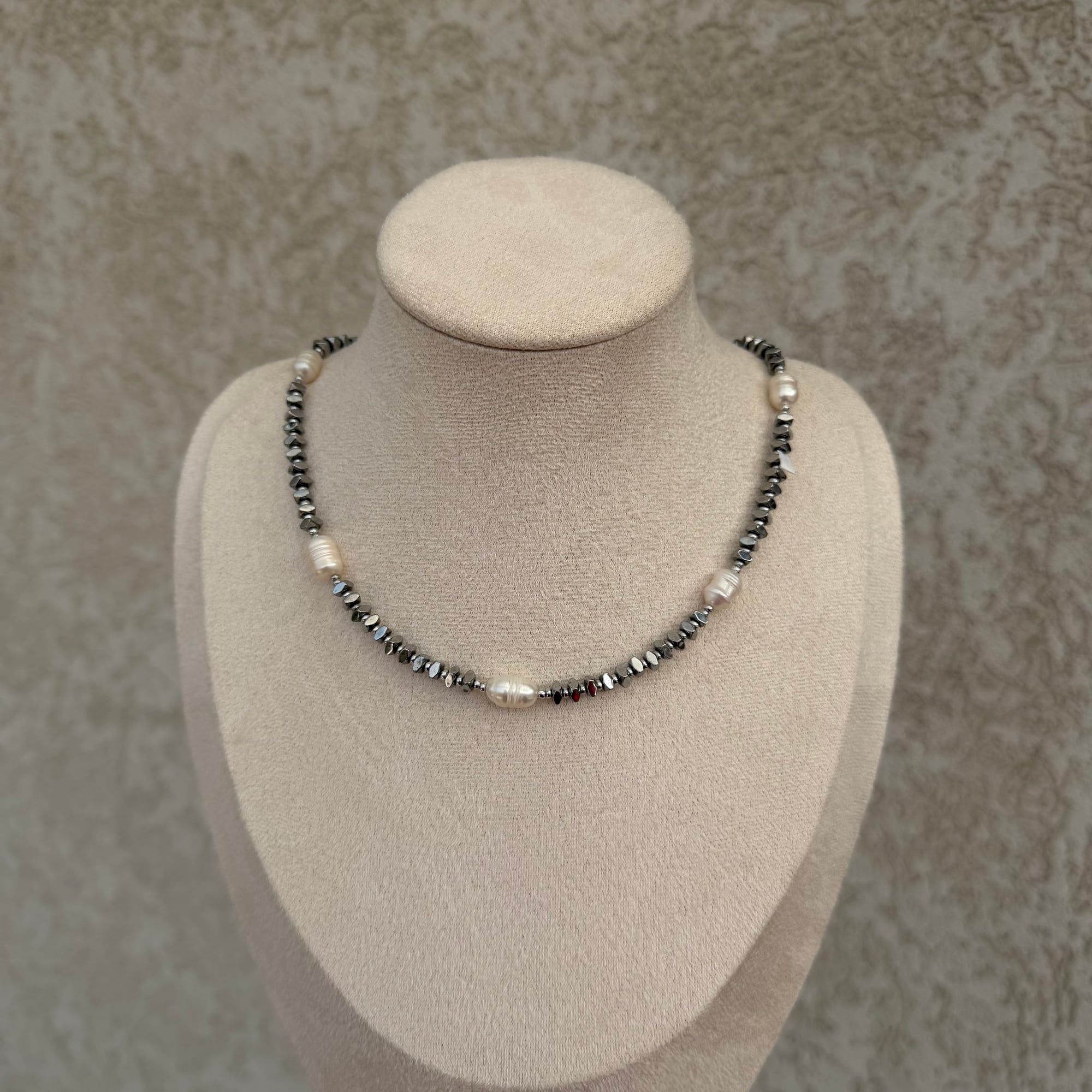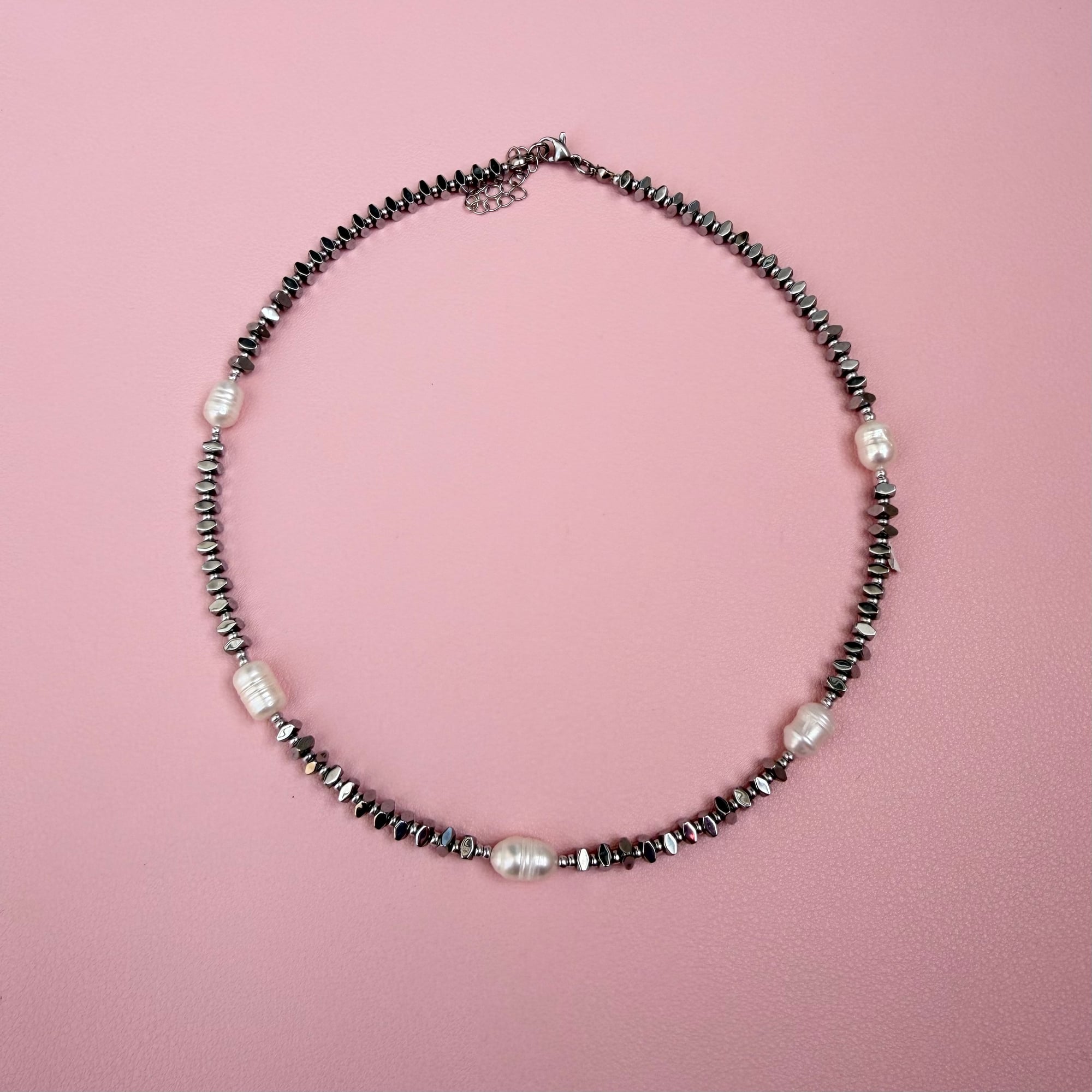 Elegantna ogrlica izrađena od srebrnog hematita, gde se između svake perle nalaze sitne okrugle perle od nerđajućeg čelika. Poseban akcenat daju pet prirodnih slatkovodnih bisera, pažljivo raspoređenih duž ogrlice, koji unose nežnost i sofisticiran kontrast metalnom sjaju.