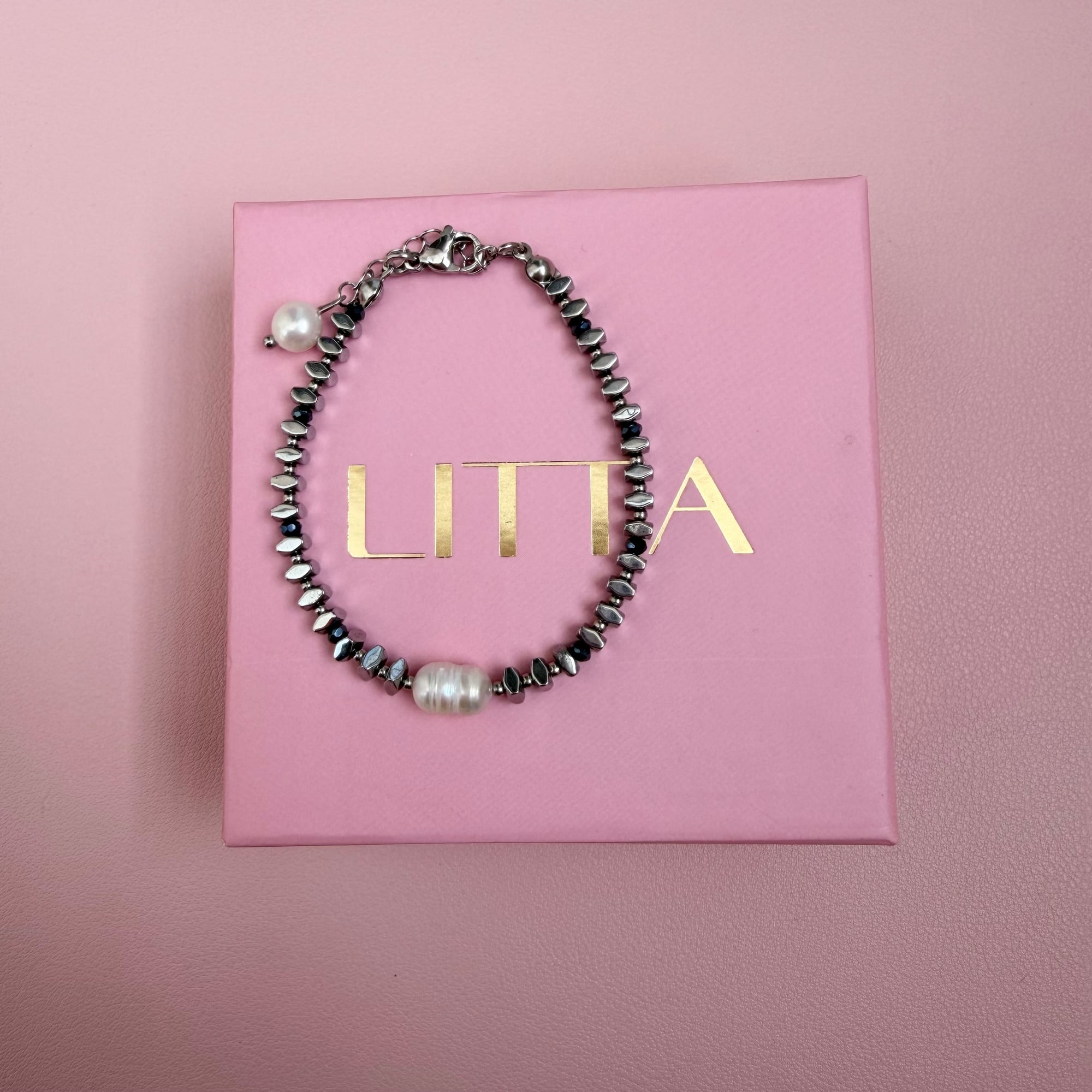 Narukvica izrađena od srebrnog hematita, sa sitnim okruglim perlama od nerđajućeg čelika između svake perle. U njenom centru nalazi se jedan prirodni slatkovodni biser koji daje poseban, elegantan akcenat.