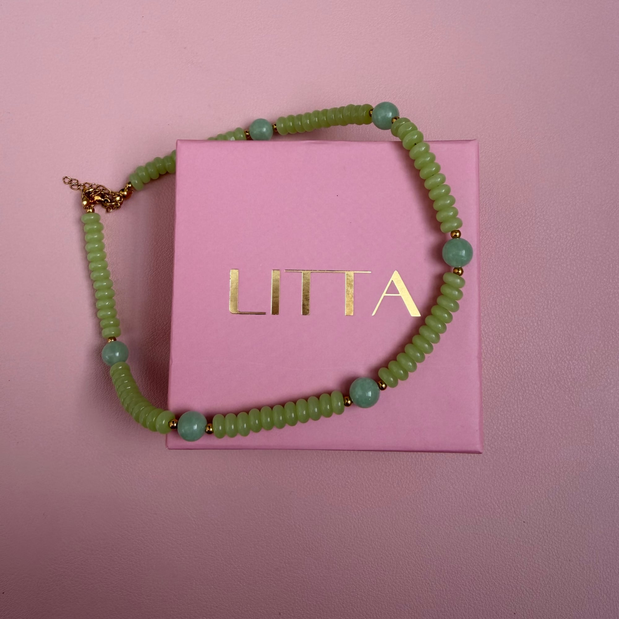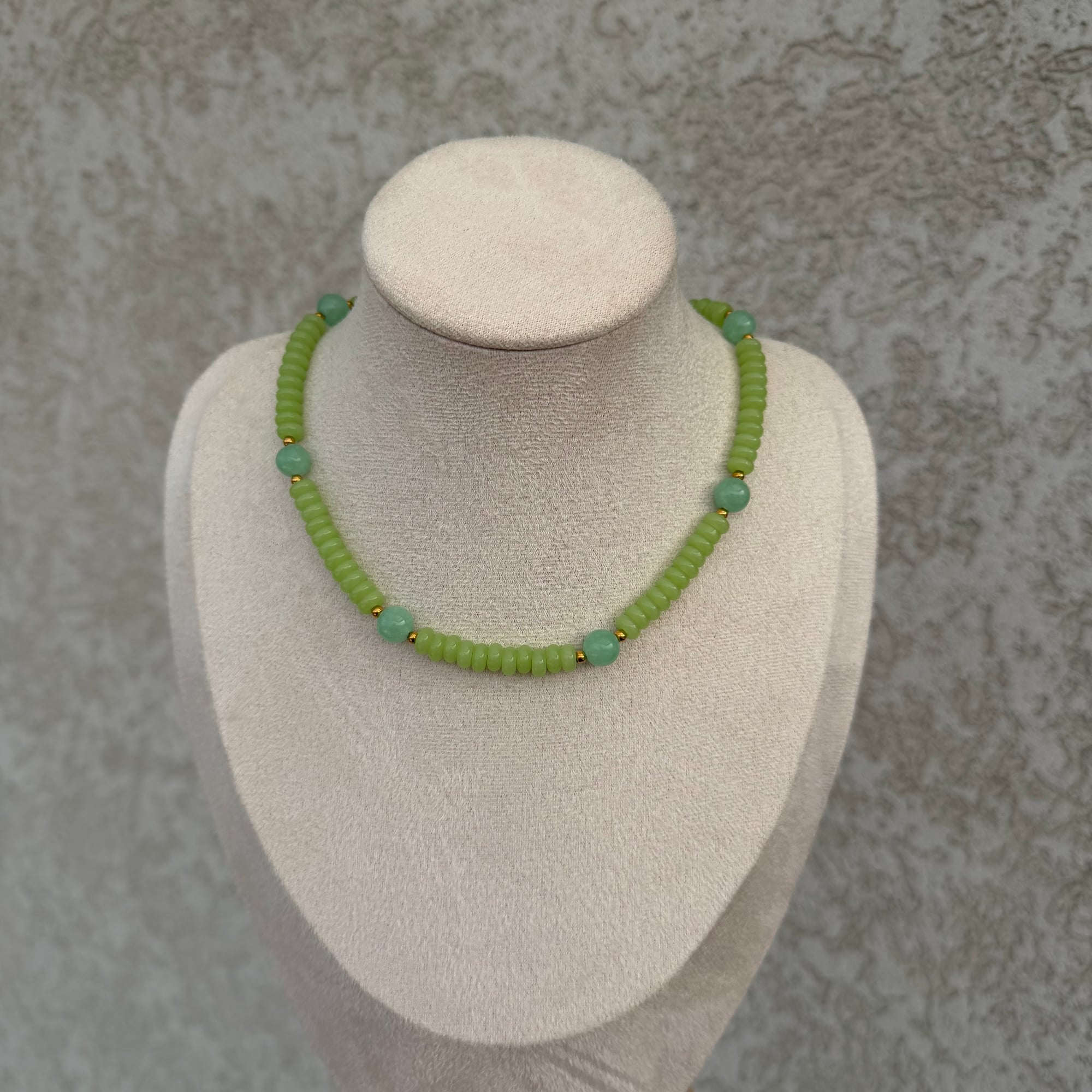 Ogrlica izrađena od zelenih perli, sa pažljivo raspoređenim perlama prirodnog zelenog aventurina koje daju poseban, sofisticiran akcenat. Različite nijanse zelene stvaraju harmoničan i osvežavajući izgled, inspirisan prirodom.