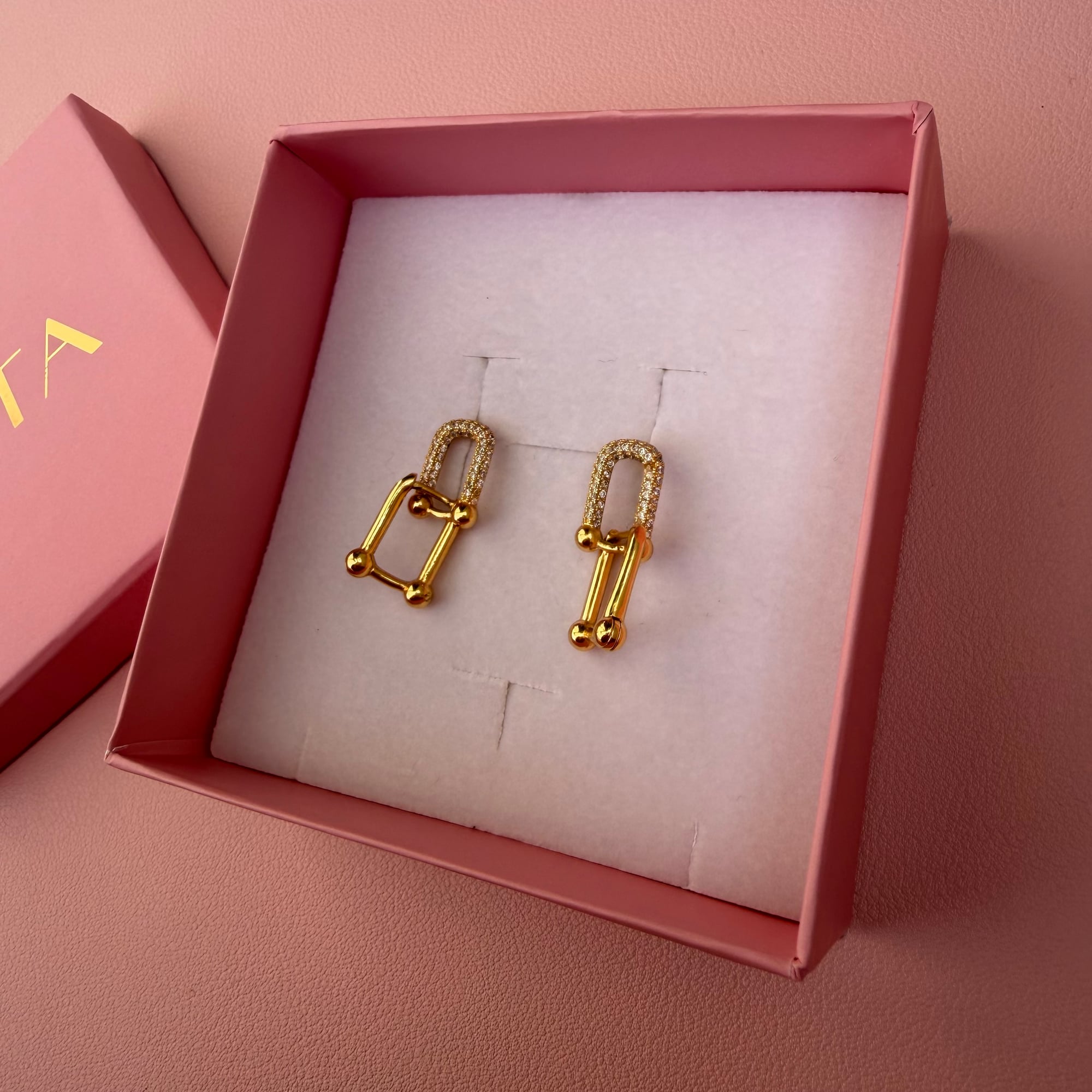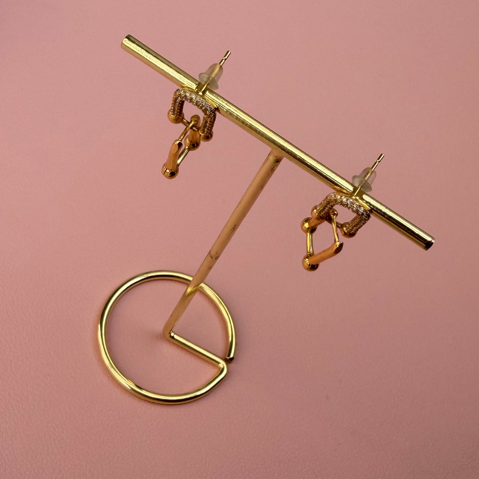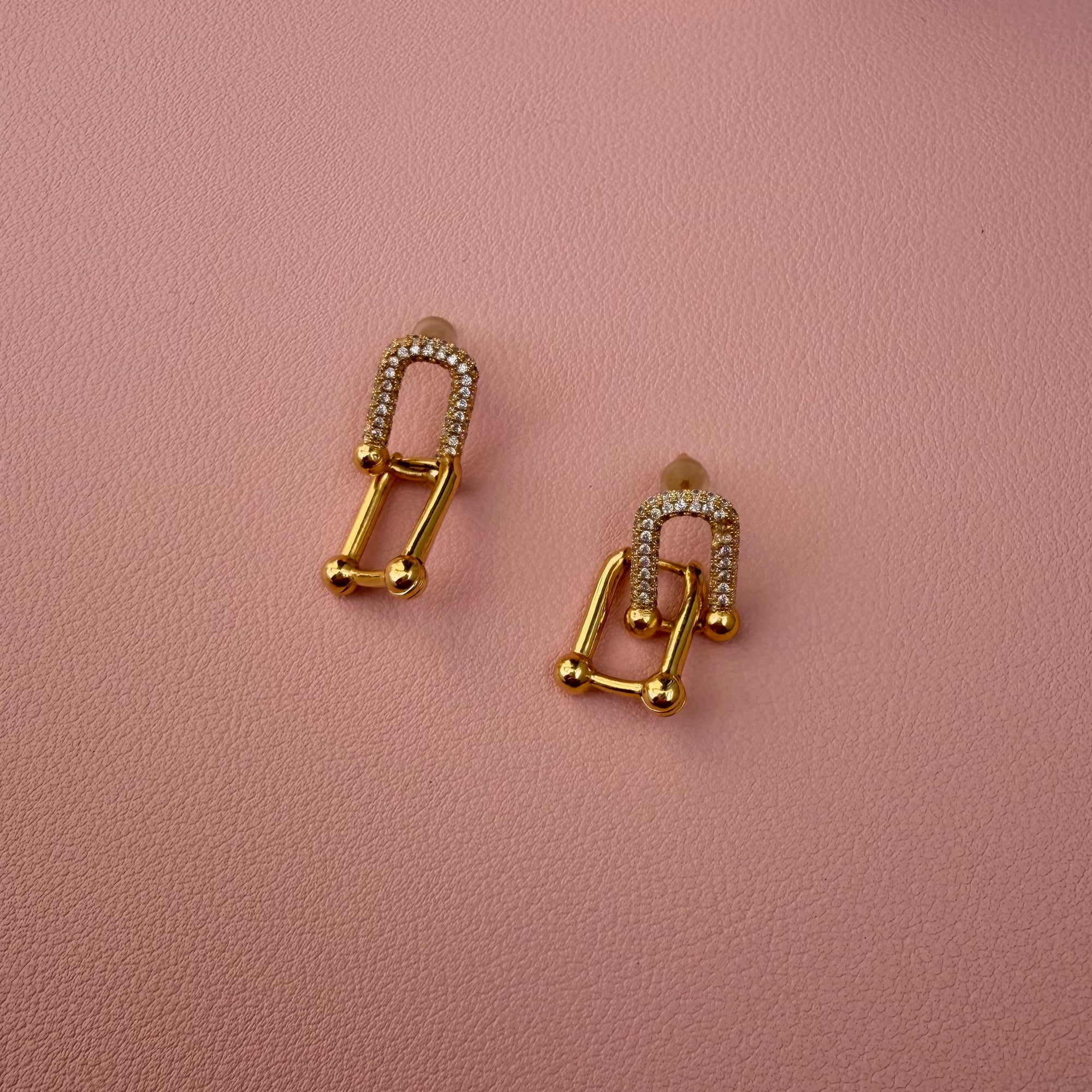 Elegantne mindjuše od nerđajućeg čelika u zlatnoj boji, ukrašene suptilnim cirkonima koji daju diskretan, ali primetan sjaj. Model je na šraf, što ih čini sigurnim i udobnim za nošenje tokom celog dana.