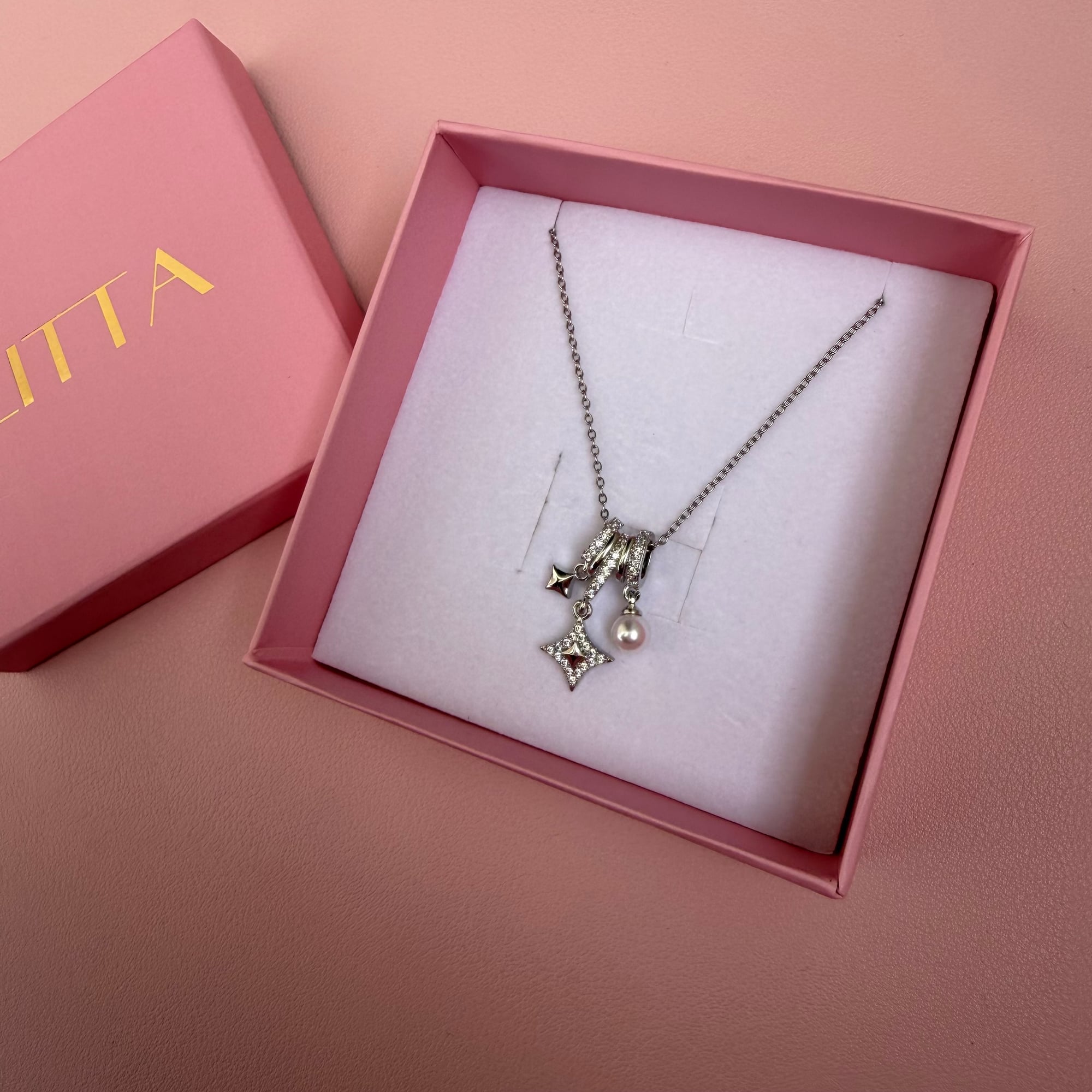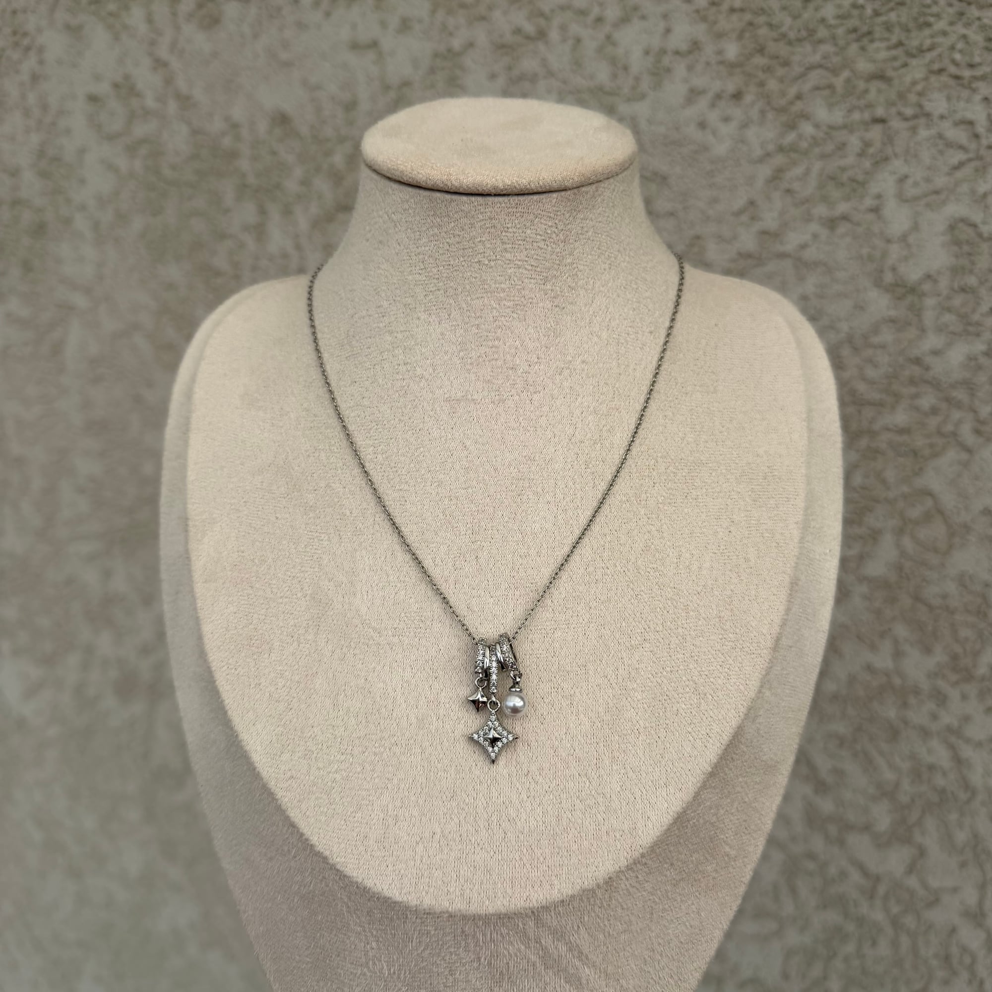Elegantna srebrna ogrlica od nerđajućeg čelika sa više privezaka ukrašenih cirkonima. Kombinacija sitnih detalja i blistavog sjaja daje moderan, efektan izgled koji privlači pažnju, a pritom ostaje sofisticiran i lako uklopiv uz različite stilove.