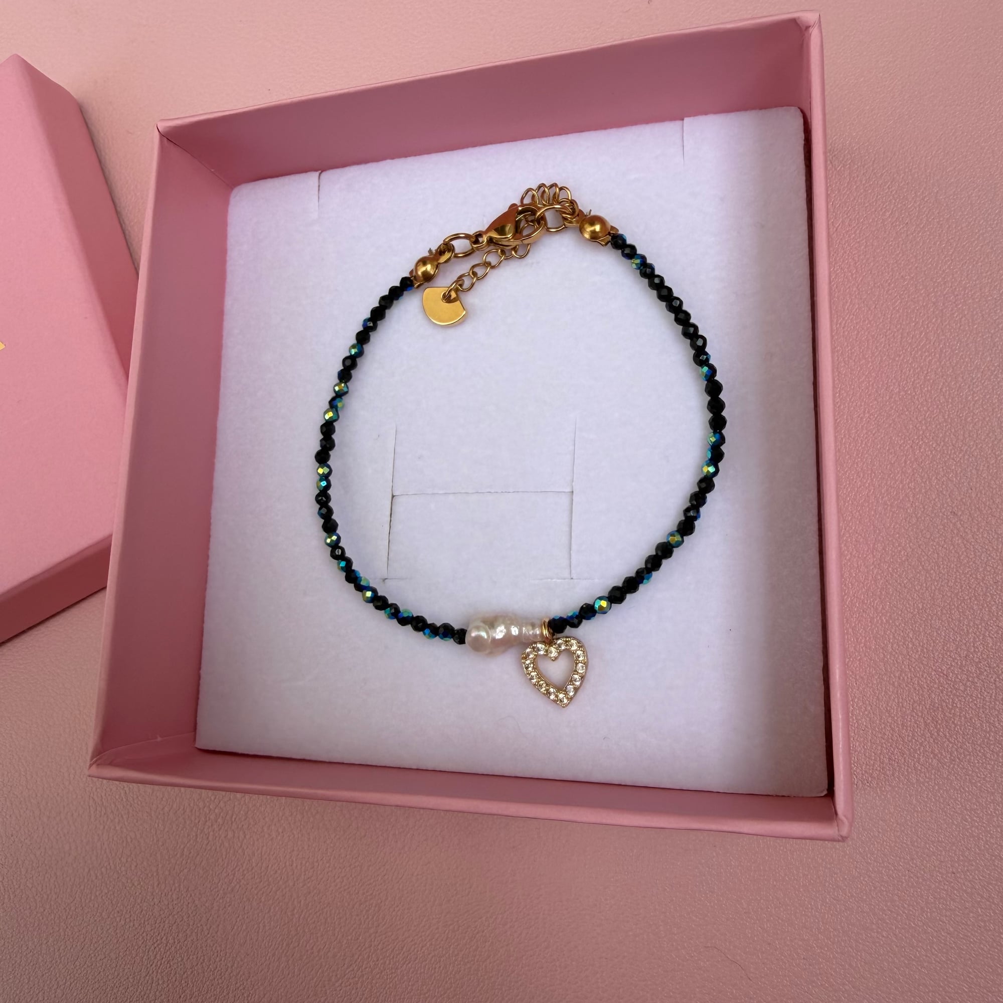 Narukvica od teget kristalnih perli odiše dubinom i sofisticiranošću. U središtu se nalazi privezak u obliku srca sa cirkonima koji donosi diskretan sjaj i romantičnu notu, dok biser dodatno naglašava eleganciju ovog modela.
