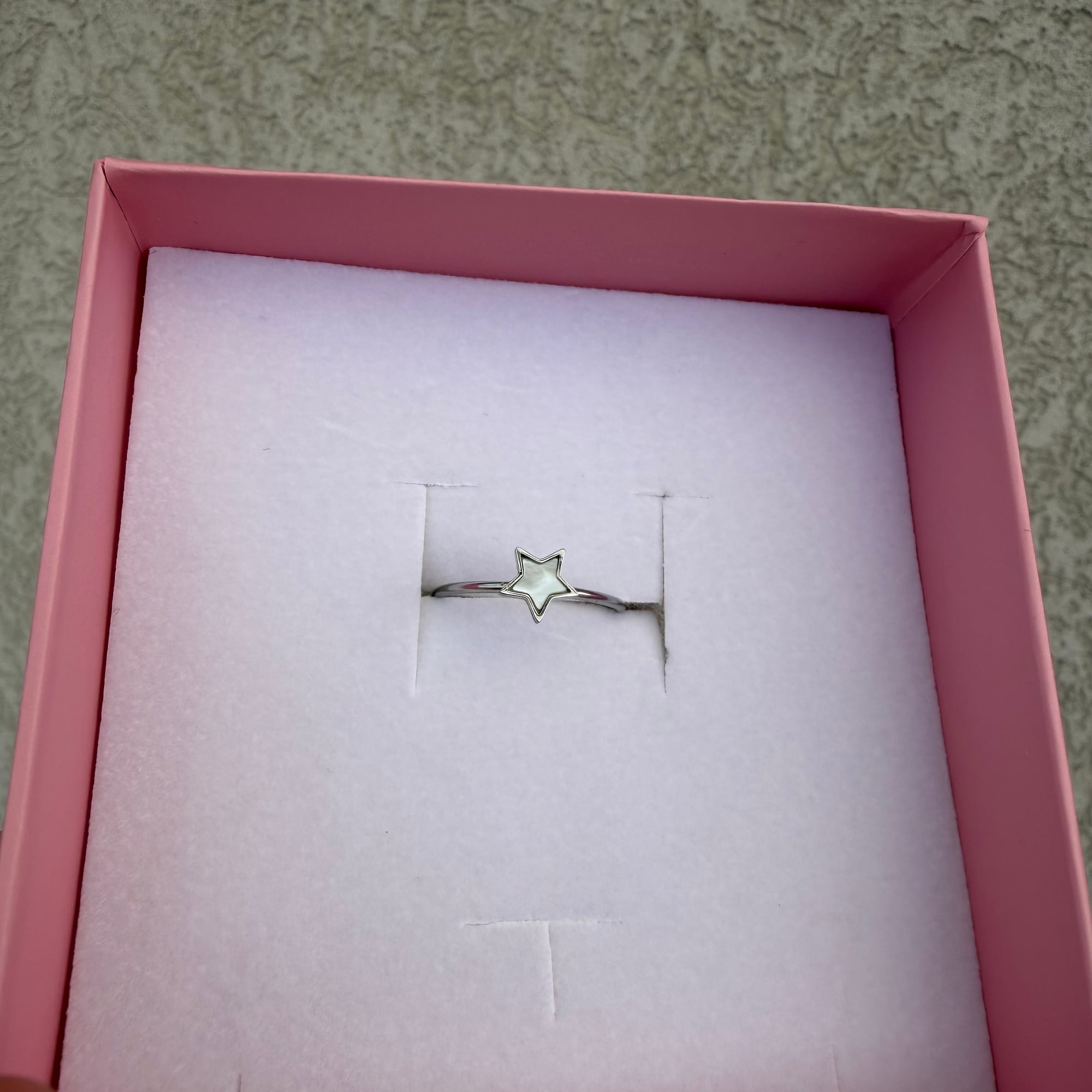 Srebrni prsten izrađen od nerđajućeg čelika, sa priveskom u obliku zvezde od sedefa koji mu daje nežan, svetlucav akcenat. Kombinacija metala i prirodnog materijala stvara savršen balans između minimalizma i elegancije.