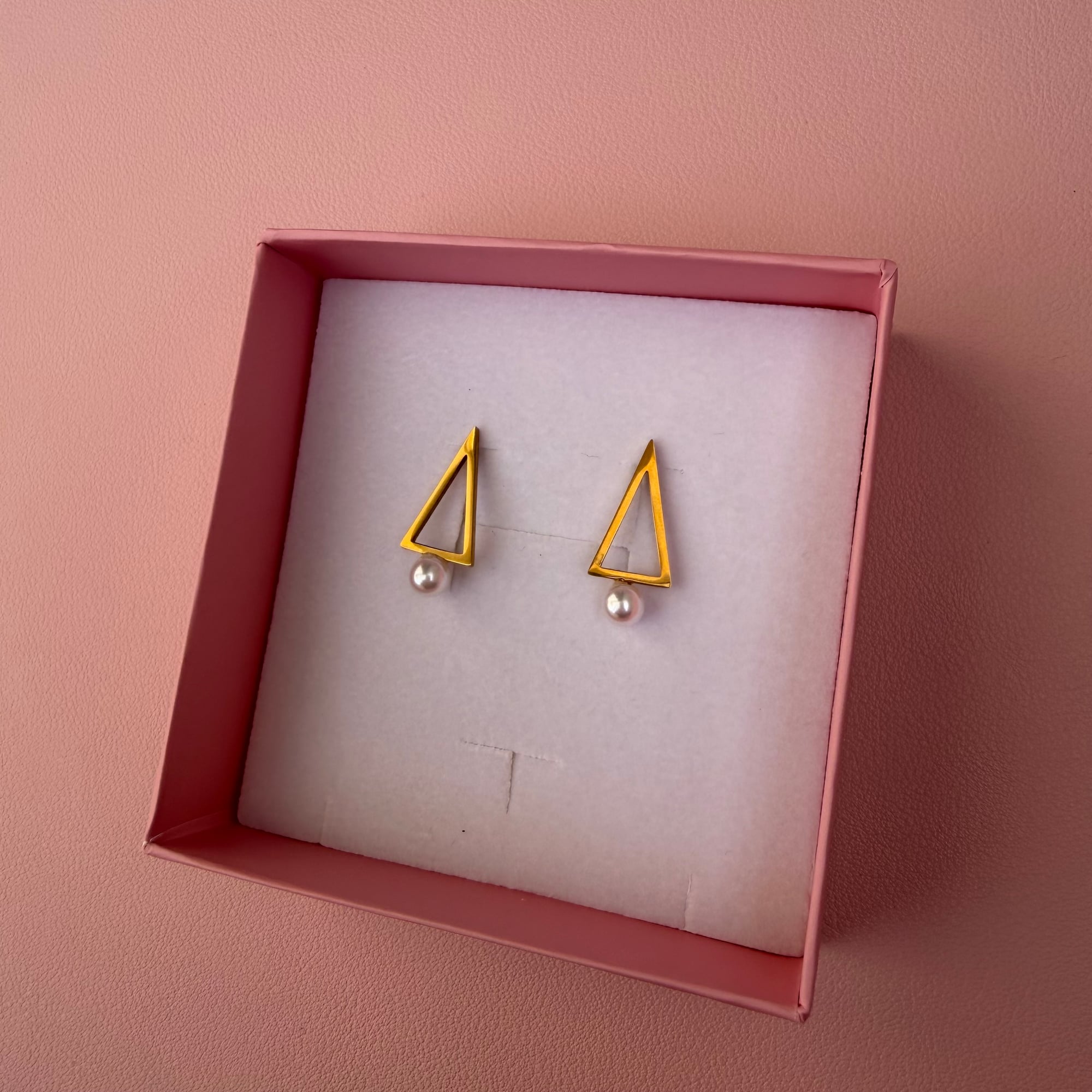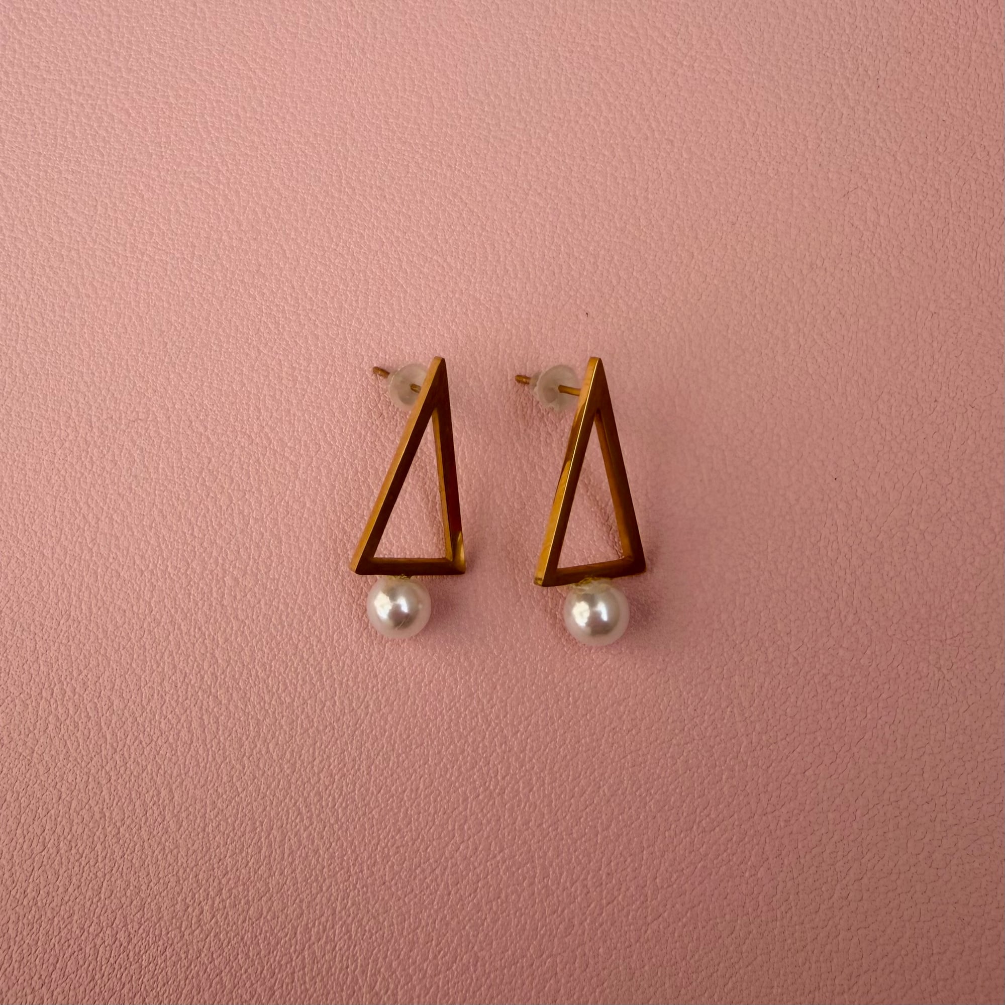 Elegantne minđuše izrađene od nerđajućeg čelika u zlatnoj boji, sa modernim geometrijskim elementom u obliku trougla i visećim biserom kao završnim detaljem. Spoj čistih linija i klasičnog bisera daje im sofisticiran, ali savremen izgled.