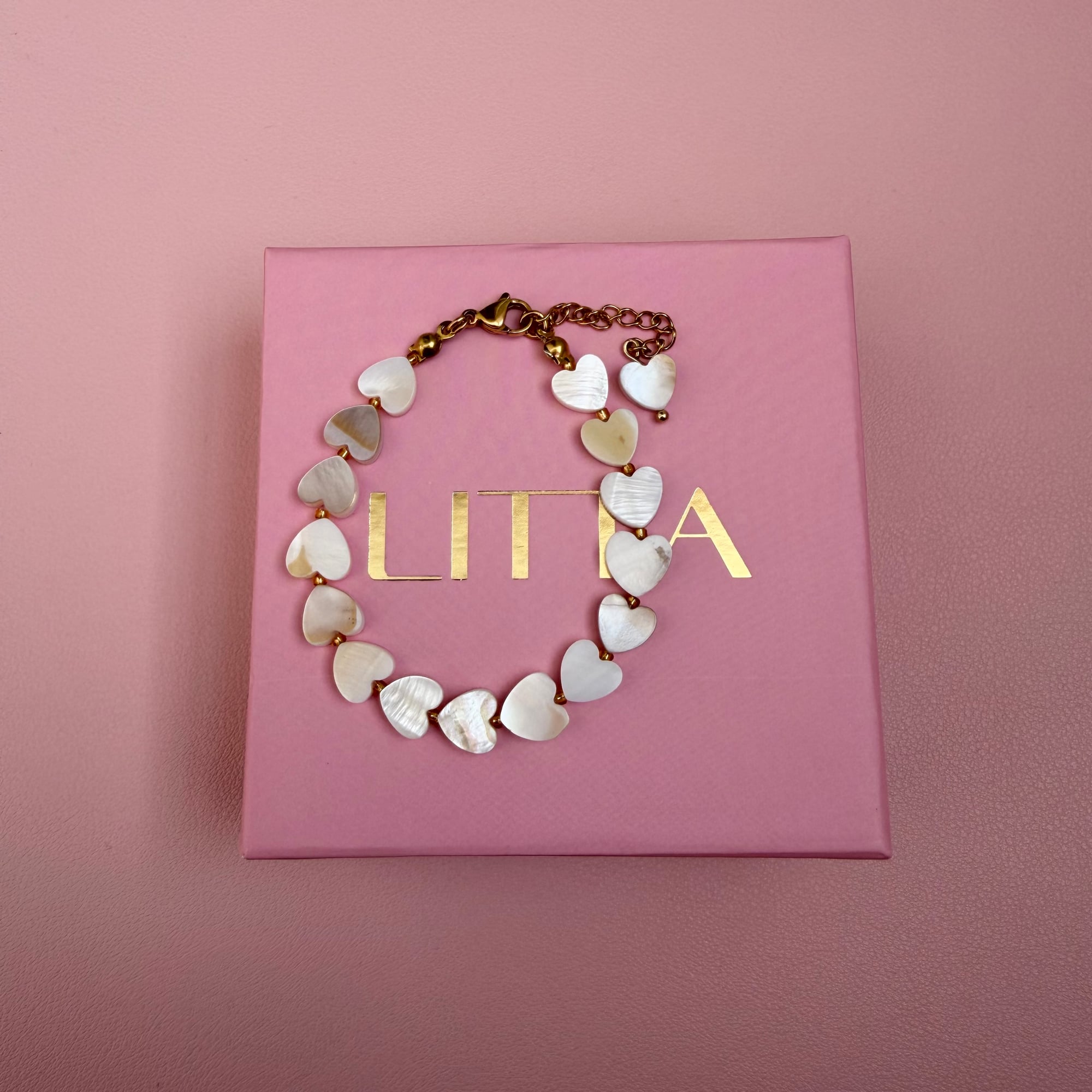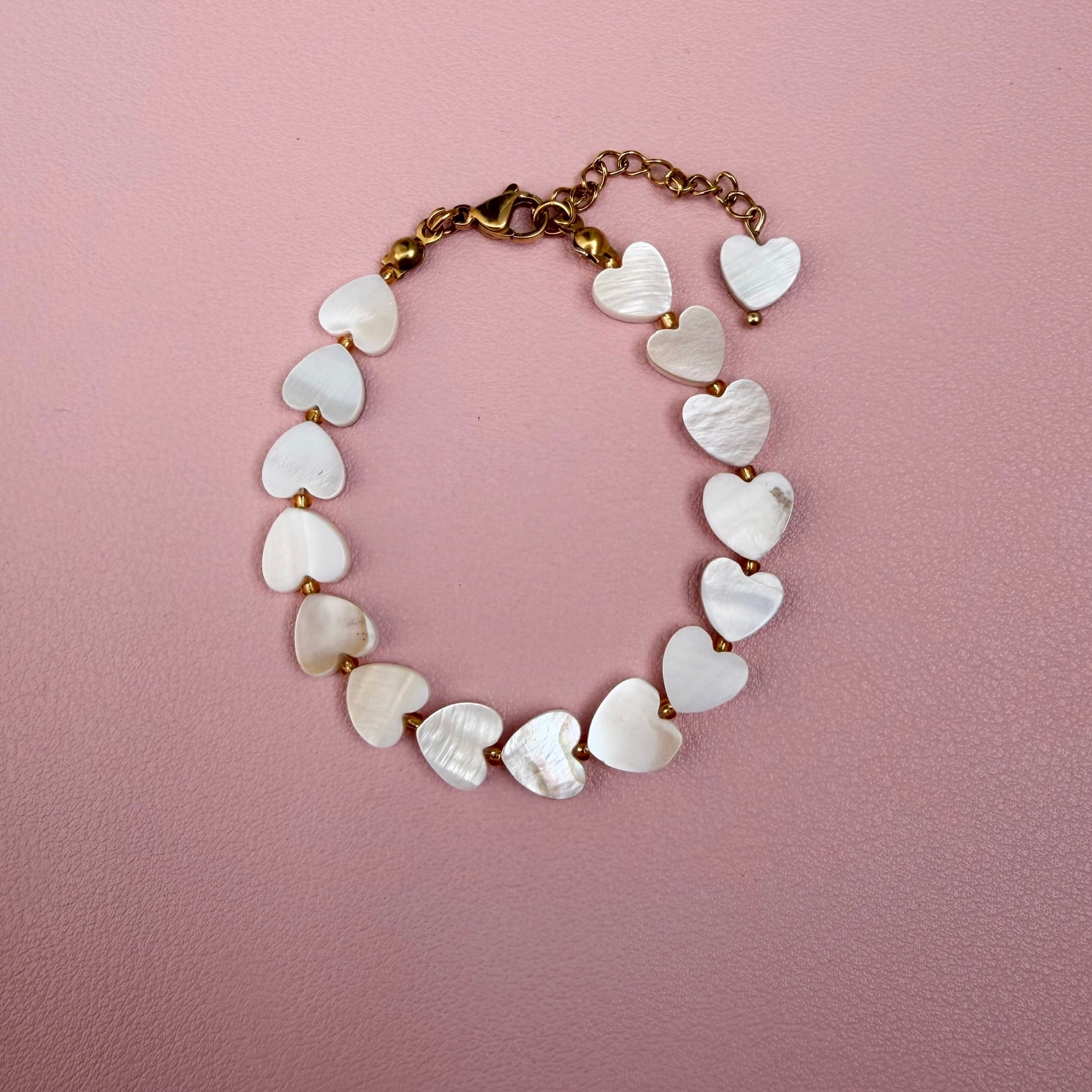 Nežna narukvica od sedefa u obliku srca. Sedef odiše suptilnim sjajem i elegancijom, dok oblik srca simbolizuje ljubav, nežnost i emotivnu povezanost.