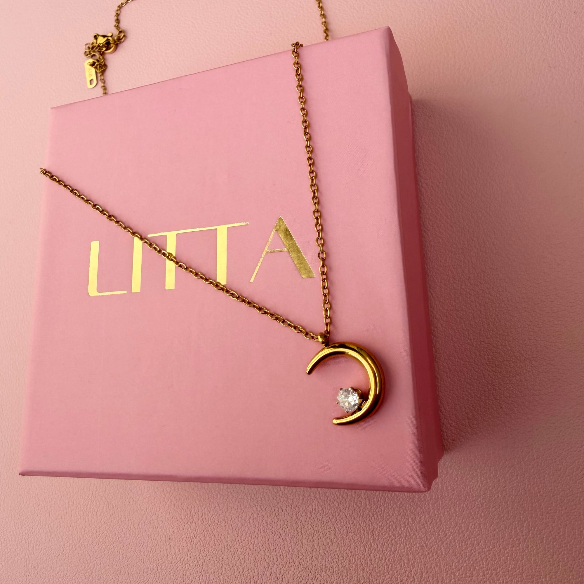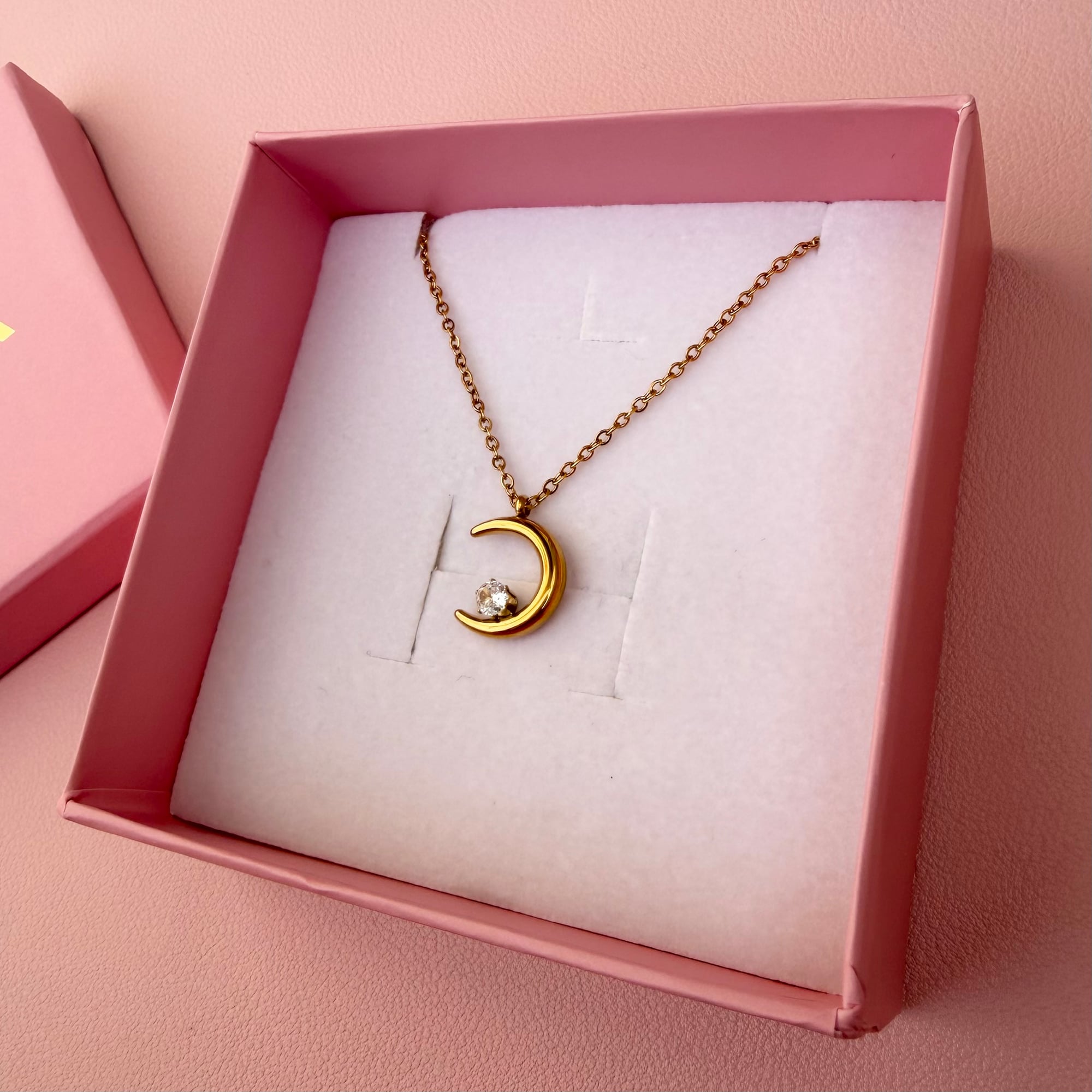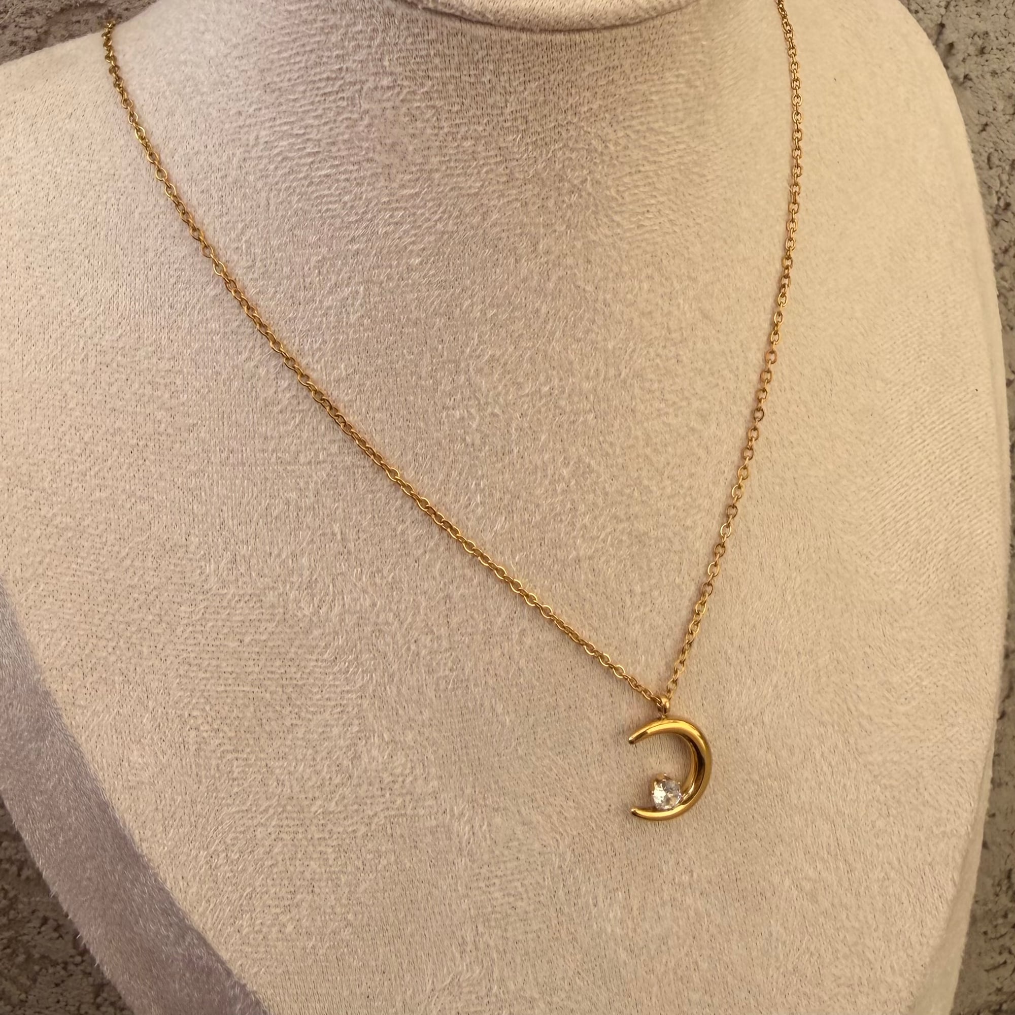 Elegantna ogrlica izrađena od nerđajućeg čelika u zlatnoj boji sa nežnim priveskom u obliku meseca koji u sebi nosi svetlucavi cirkon. Ovaj sofisticirani detalj simbolizuje ženstvenost, intuiciju i suptilnu eleganciju, čineći ogrlicu posebnim komadom nakita koji privlači pažnju.