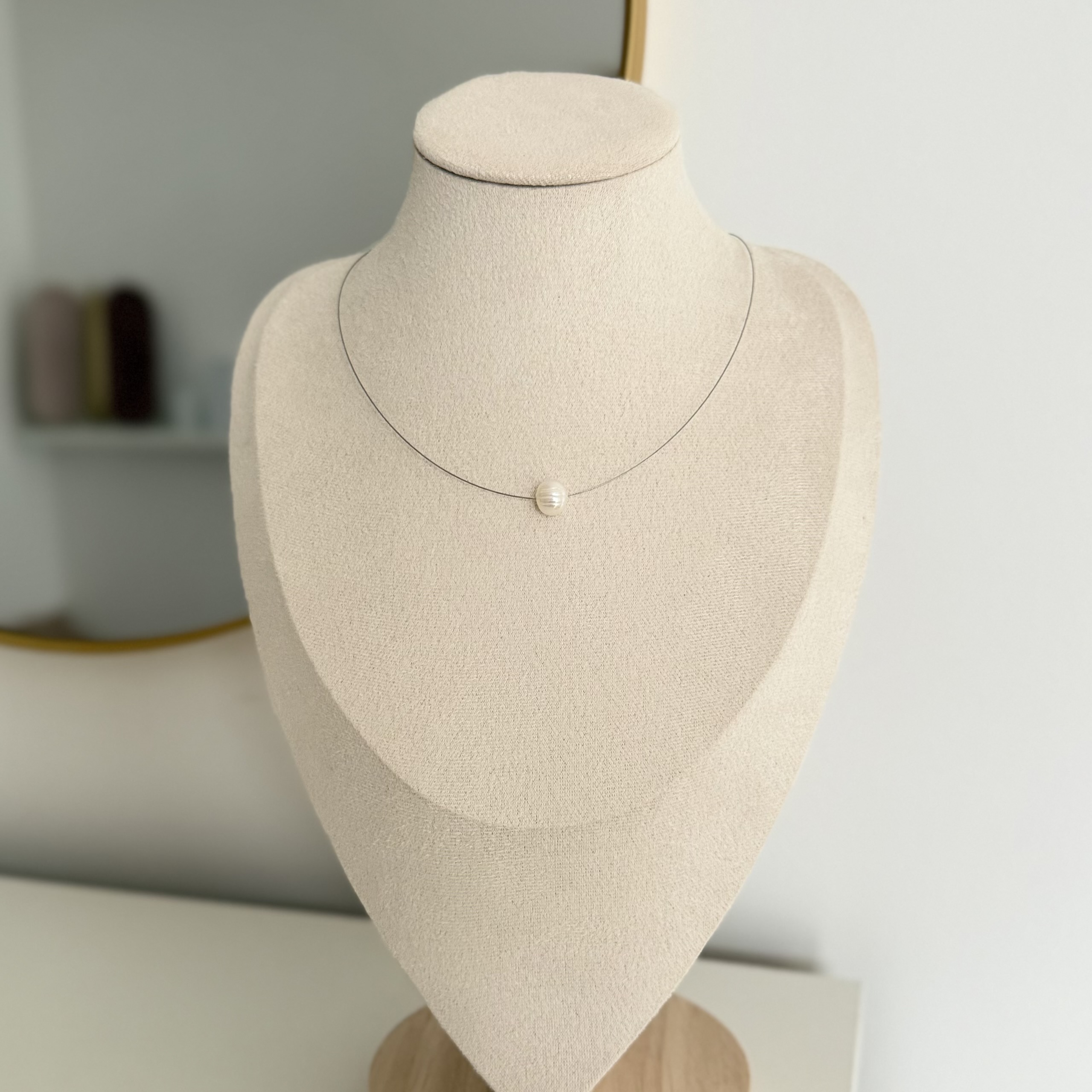 Klasičan i nežan komad nakita, idealan za svakodnevne i svečanije prilike. Lako se uklapa uz ostali nakit. Materijal: nerđajući čelik i prirodni biser Dužina: 39cm + 5cm Izrada: ručni rad Ogrlica dolazi u brendiranoj poklon kutiji. Zbog svoje tanke izrade, sajlicom je potrebno pažljivo rukovati i čuvati kako bi se zadržala njena forma.